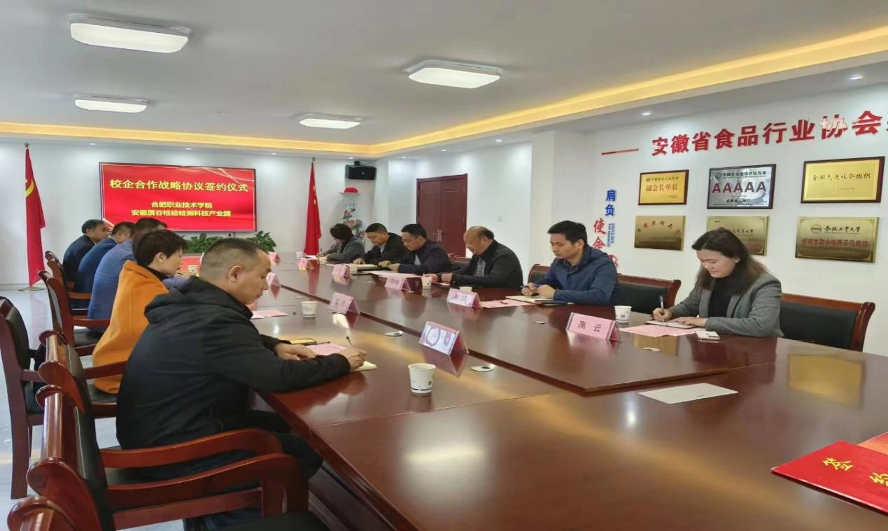校党委委员、副校长周晓隆教授带领科技处、发展规划处等部门负责人参加签约仪式。合肥市市场监督管理局认证认可和检验检测处处长吴飞,包河经开区管委会党工委委员、副主任杨牧,市场监督管理局质检科副科长吴琛,安徽质谷检验检测科技产业园总经理王庆,安徽海量技术检测服务有限公司总经理伋云等政府、园区、企业的负责人出席签约仪式。