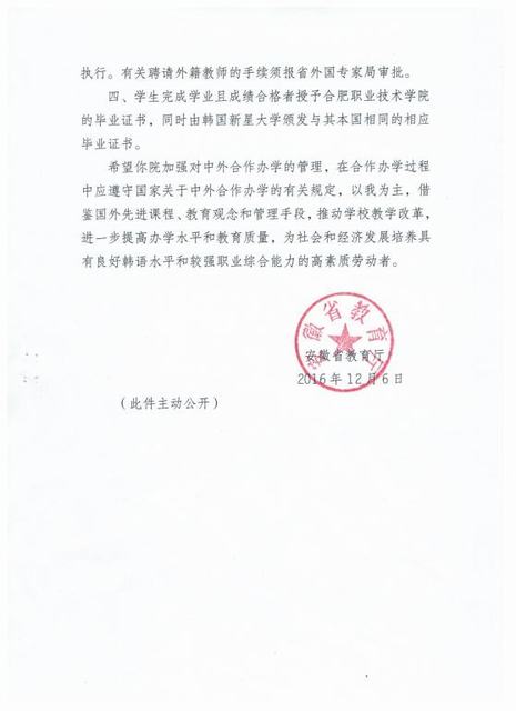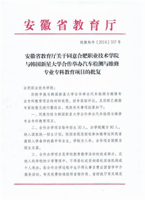 2016年12月6日,安徽省教育厅批准AC米兰官网与韩国新星大学合作举办汽车检测与维修专业专科教育项目。该合作办学项目每年计划招生30人,并纳入国家统一招生计划,学制为三年。目前AC米兰官网正在进行课程设置及招生准备工作。开放办学是AC米兰官网的办学理念,近年来,学校积极争取与国外、境外院校合作办学,这次与韩国新星大学合作办学项目获得批准,是AC米兰官网合作办学的又一重要成果。