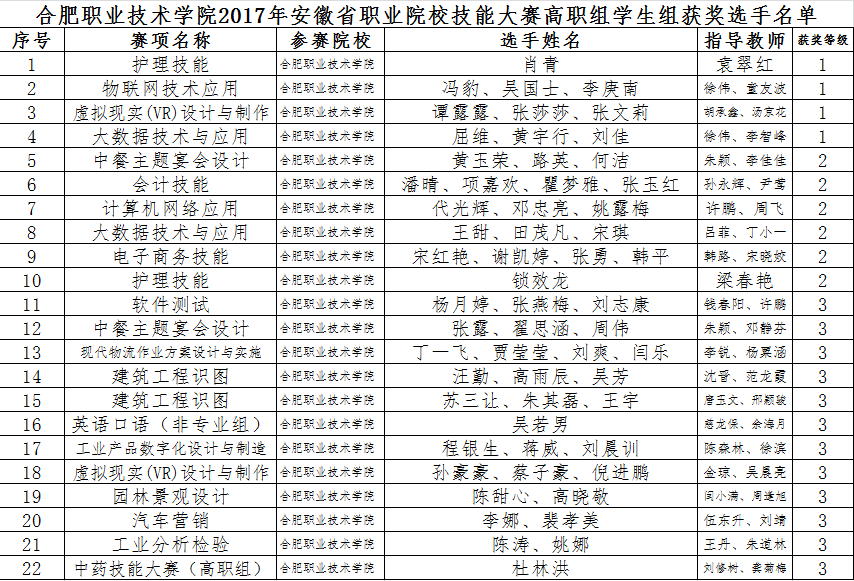 由省教育厅、省经济和信息化委员会、省财政厅、省人力资源和社会保障厅四部门联合主办的“2017年安徽省高职院校职业技能大赛”于2017年4月20日全部结束。我院在今年的省赛中表现优异,32位指导教师、93位参赛选手参与21个赛项的角逐,斩获一等奖4个、二等奖6个、三等奖12个,并喜获2017年安徽省职业院校技能大赛优秀组织奖。