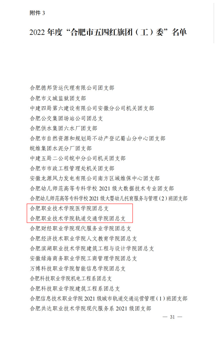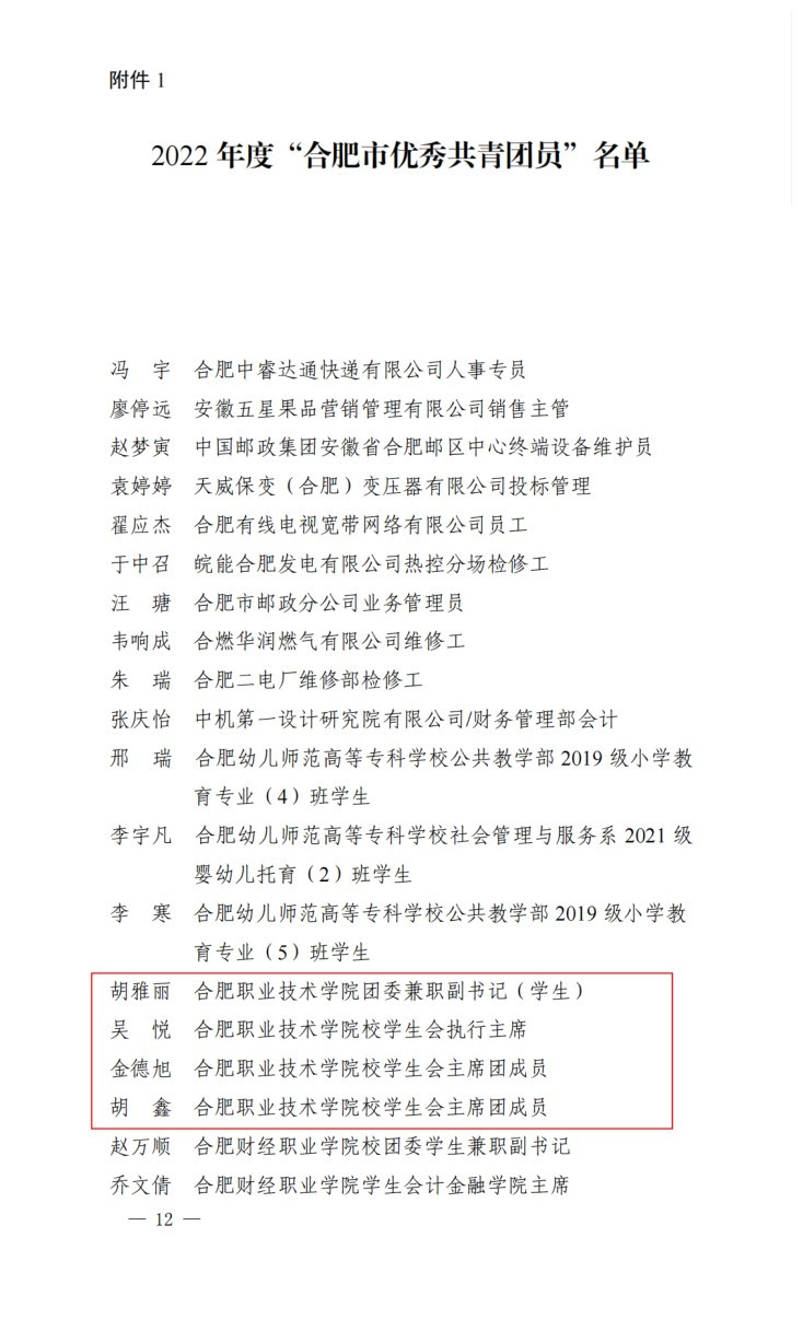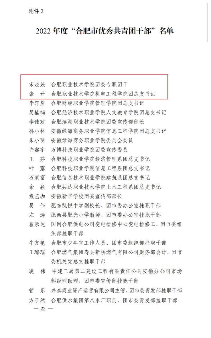 为充分发挥先进典型示范作用,激励广大团组织和团员、团干部比学赶超、再创佳绩,共青团合肥市委员会于近日下发《关于表彰2022年度“全市优秀共青团员”“全市优秀共青团干部”“全市五四红旗团委(团支部)“的决定》(合青〔2023〕23号)。AC米兰官网医学院团总支、轨道交通学院团总支分别荣获2022 年度“合肥市五四红旗团(总)支部”称号,校团委专职团干宋晓姣、机电工程团总支书记张开分别荣获2022 年度“合肥市优秀共青团干部”称号,胡雅丽、吴悦、金德旭、胡鑫等四位同学分别荣获2022 年度“合肥市优秀共青团员”称号。