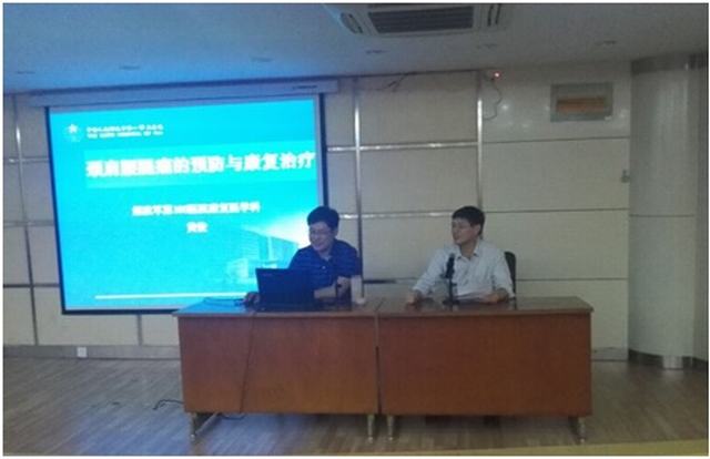 黄俊首先讲解教师职业病的类型及成因,使参会人员对教师职业病有了全面的了解;随后黄俊针对在教师职业病中具有较高发病率的颈椎病和腰椎间盘突出两大病症进行了重点介绍,分别从发病原因、发病症状、预防与治疗等方面作详细讲解,既专业又通俗易懂;最后黄俊同与会教职工进行了热烈的交流和现场诊治。