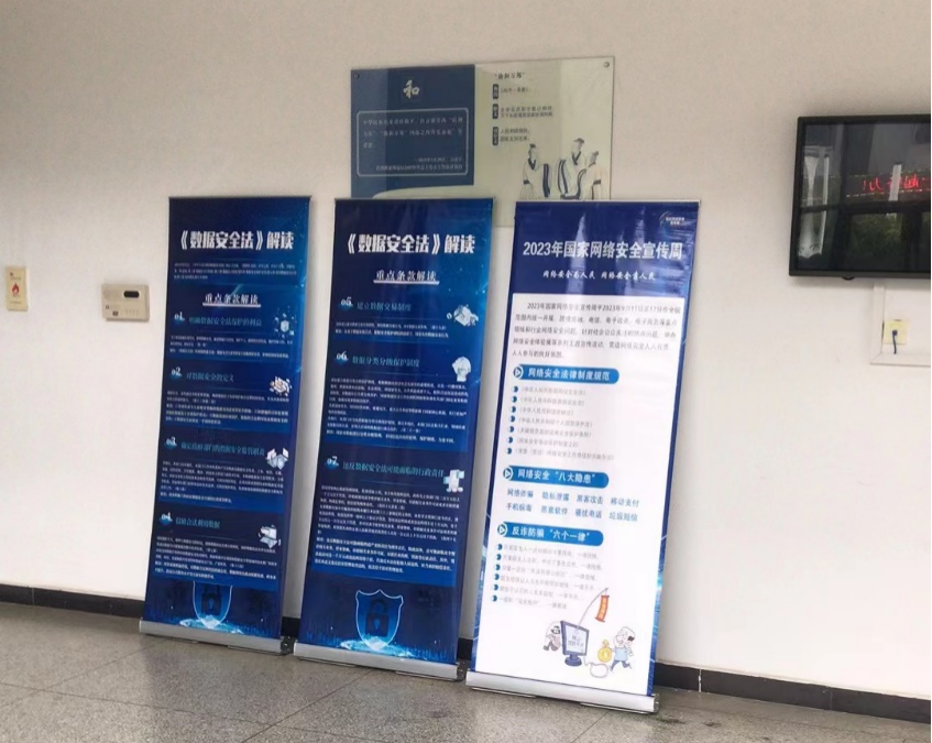 线下多渠道多载体宣传营造校园日氛围。两校区教学楼、食堂门口张贴网络安全宣传周主题海报,放置易拉宝、于校园活动日当天向师生发放网络安全主题手册,在宣传大屏播放国家网络安全宣传周推荐展映短视频,并于二级学院门口LED显示屏播放“网络安全为人民 网络安全靠人民”主题标语。