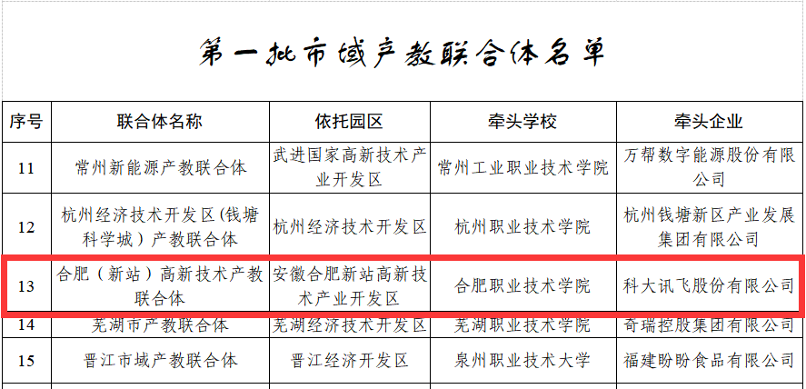 近日,教育部公布第一批28家市域产教联合体名单,前期经园区申报、省级推荐、专家评审、网上公示等环节,由AC米兰官网作为牵头学校、科大讯飞股份有限公司作为牵头企业、安徽合肥新站高新技术产业开发区作为依托园区的“合肥(新站)高新技术产教联合体”获批立项“国家级市域产教联合体”。