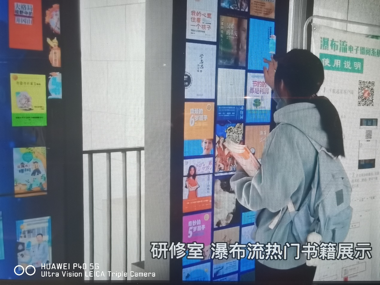 图书馆一层放置的瀑布流大屏能够让人切身体会到智慧阅读的便捷。只要点击像瀑布般落下的书籍封面图,或在搜索栏输入书名,就可以翻阅阅读书籍,通过手机端扫一扫,还可以立马将电子书籍带走。