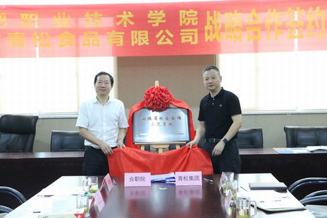 2017年7月7日上午,我院与安徽青松食品有限公司战略合作协议签约仪式在青松集团六楼会议室举行。学院副院长周晓隆与青松集团办公室主任陈明山签署校企战略合作协议,院党委书记罗兆好出席签约仪式,与青松集团董事长林松共同为“安徽省校企合作示范基地”揭牌。