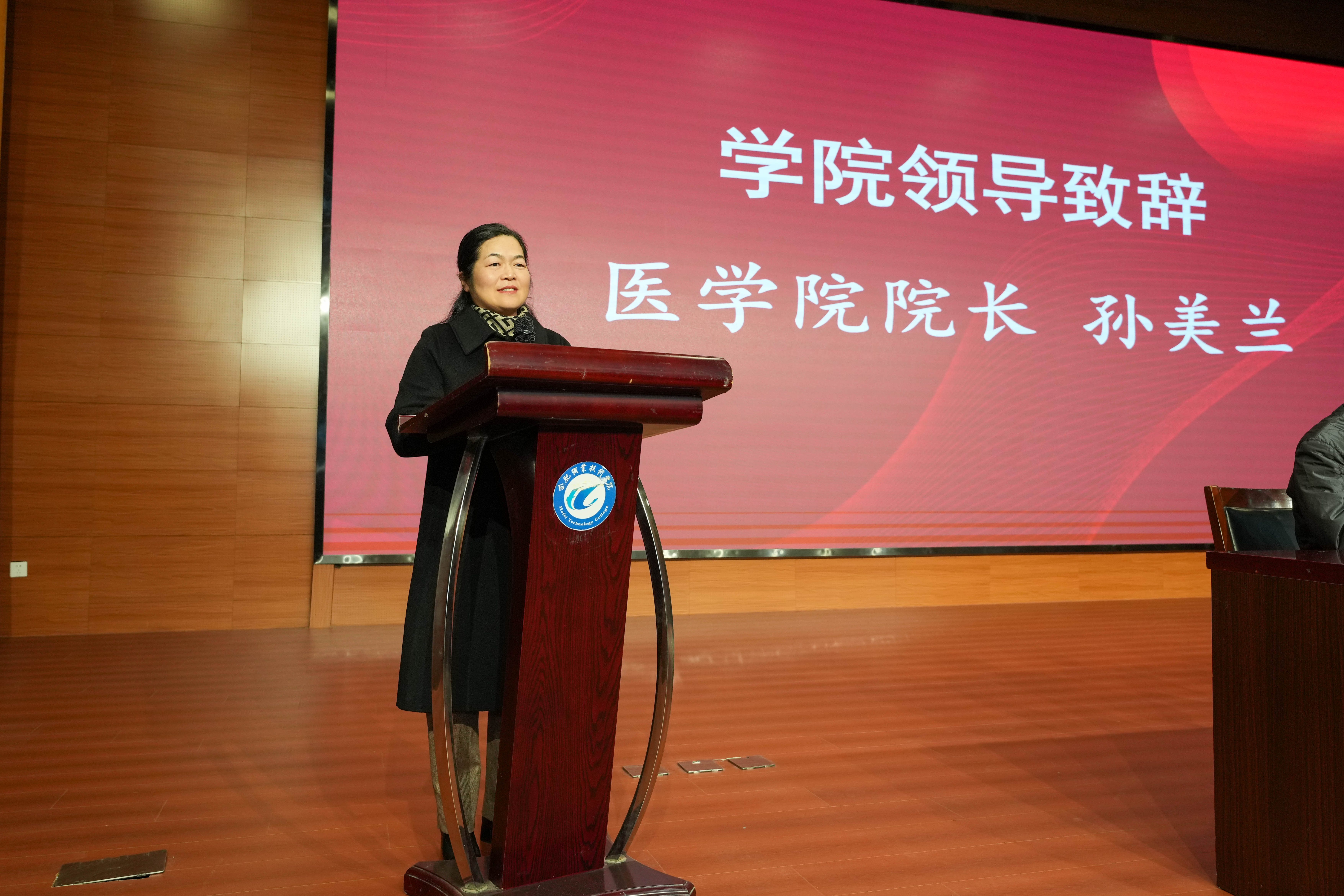 医学院院长孙美兰致辞,她代表医学院全体教职工对新同学的加入表示祝贺和欢迎,并对安徽省“一村一名大学生村医提升计划”、医学院办学历史、师资队伍、实训条件、教学课程及资源等做了介绍。希望新同学能够珍惜宝贵的学习机会,进一步夯实医学基础,强化临床技能,成为一名优秀的基层健康卫生工作者,成为一名“小病善治、大病善识、重病善转、慢病善管”的全科医生。