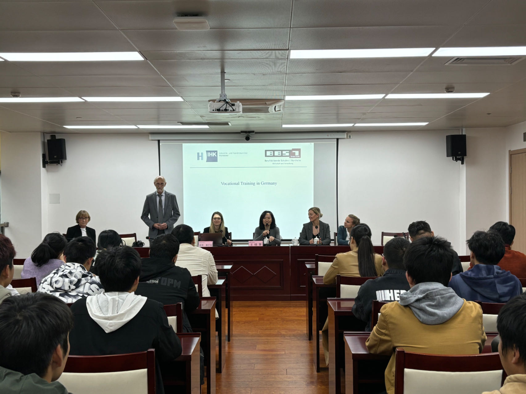 檀明对诺德海姆第一职业学校一行表示欢迎,简要介绍了学校情况。他说,两校交往已久,师生交流成果丰富。费巴格先生此次率团来访有助于两校教师间深化合作。希望以此次访问为契机,推动两校师生开展互学互鉴,经验分享,书写两校友好交往的新篇章。