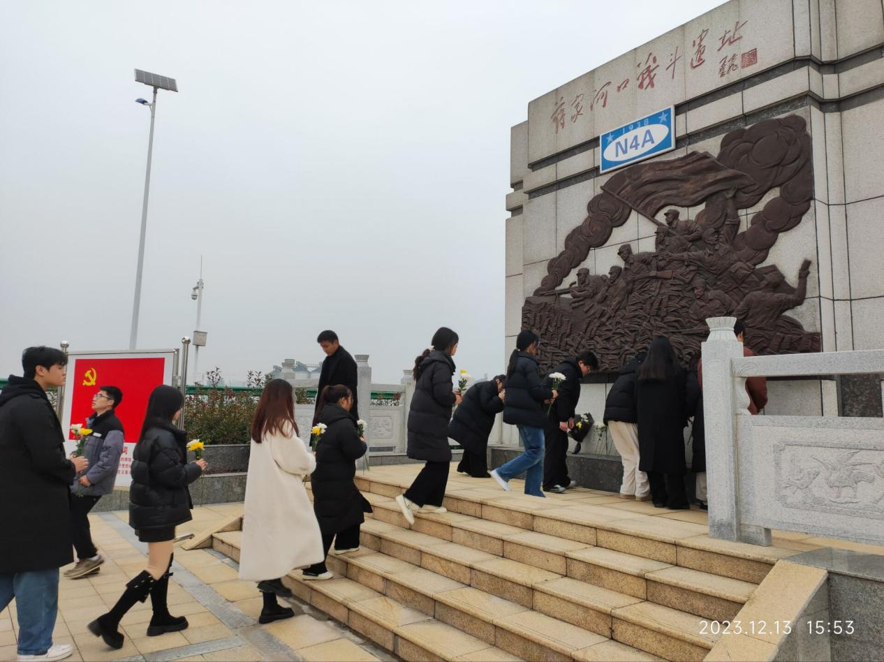 随后,同学们来到了巢湖市爱国主义教育基地蒋家河口战斗遗址。在遗址前,所有人员列队肃穆地站立在遗址广场纪念碑前,聆听蒋家河口战斗故事,逐一向纪念碑敬献鲜花,全体人员面对纪念碑,向抗日先烈鞠躬。