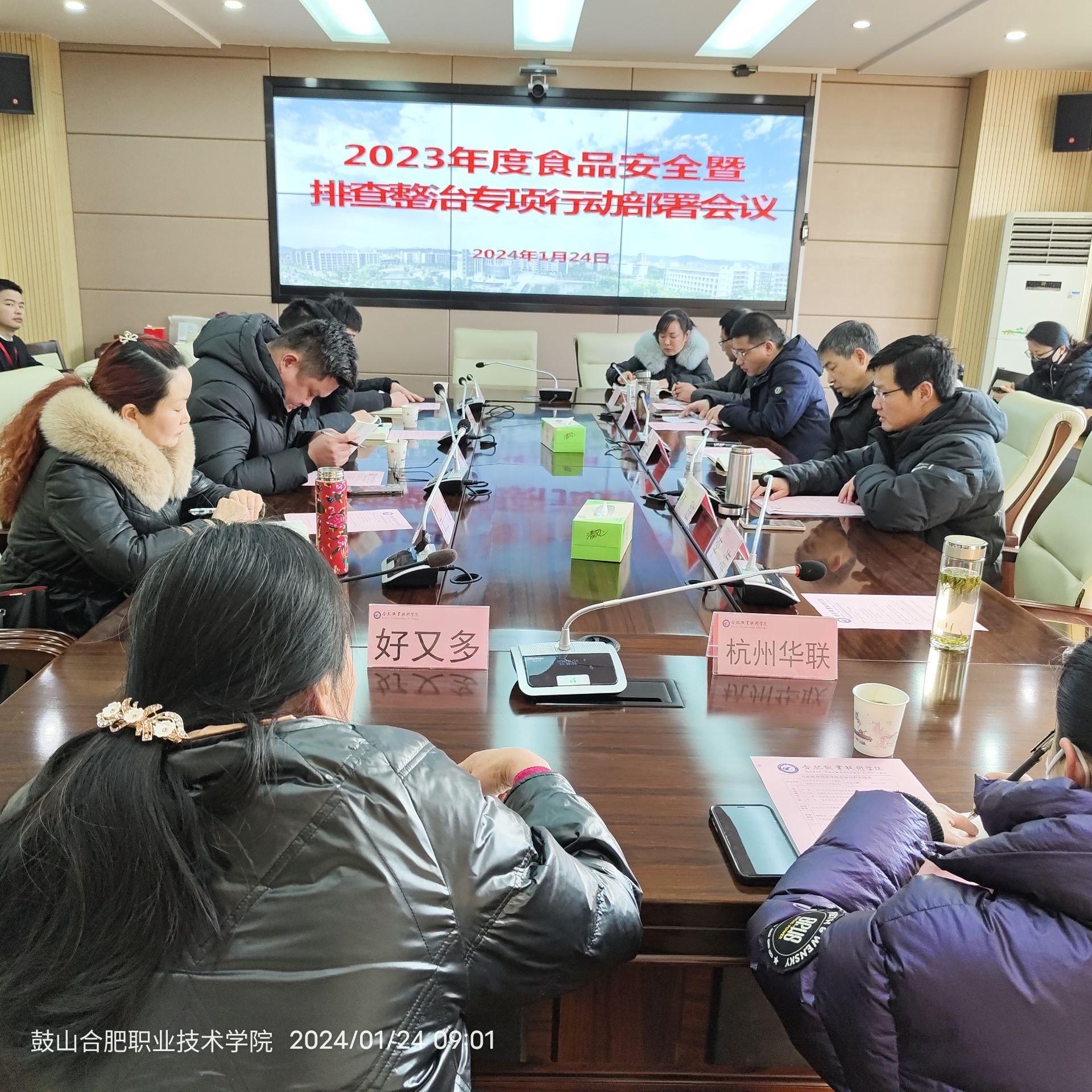 1月24日上午,学校在崇德楼三楼会议室召开了2023年度食品安全工作会暨校园食品安全排查整治专项行动部署会。安巢经开区市场监督管理局潘能成副局长及相关科室负责人,学校总务处相关科室负责人,校内各食堂、超市等经营单位食品安全总监及食品安全员、项目经理参加了会议。会议由总务处处长林胜主持。
