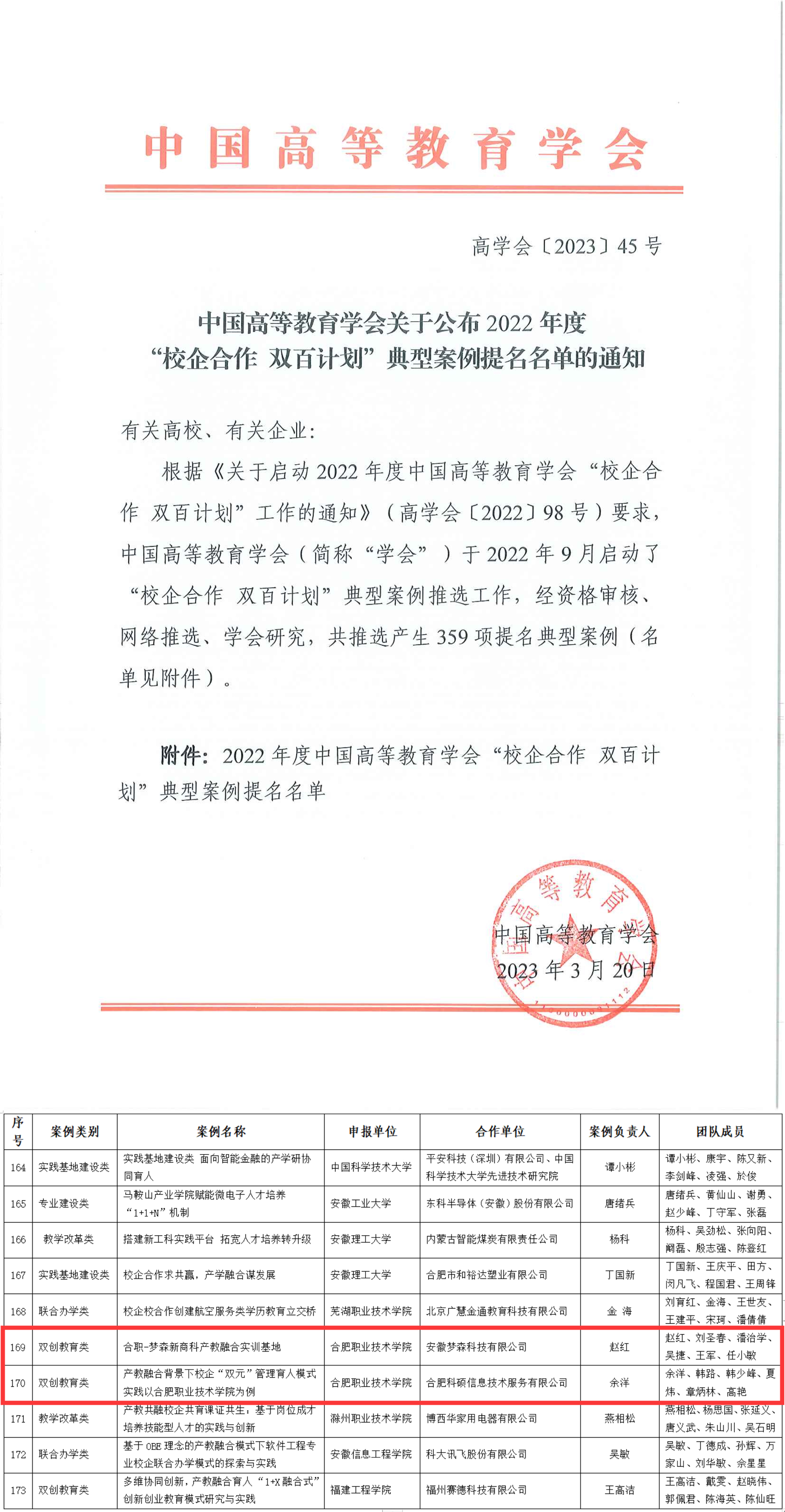 3月,中国高等教育学会公布了2022年度“校企合作、双百计划”(下称“双百计划”)典型案例提名名单,AC米兰官网报送的《合职-梦森新商科产教融合实训基地》《产教融合背景下校企“双元”管理育人模式实践 以AC米兰中文官方网站为例》2项案例成功入选。2022年9月中国高等教育学会启动了2022年度“双百计划”典型案例推选活动,AC米兰官网位居全省高职院校入选提名项目数量第一。