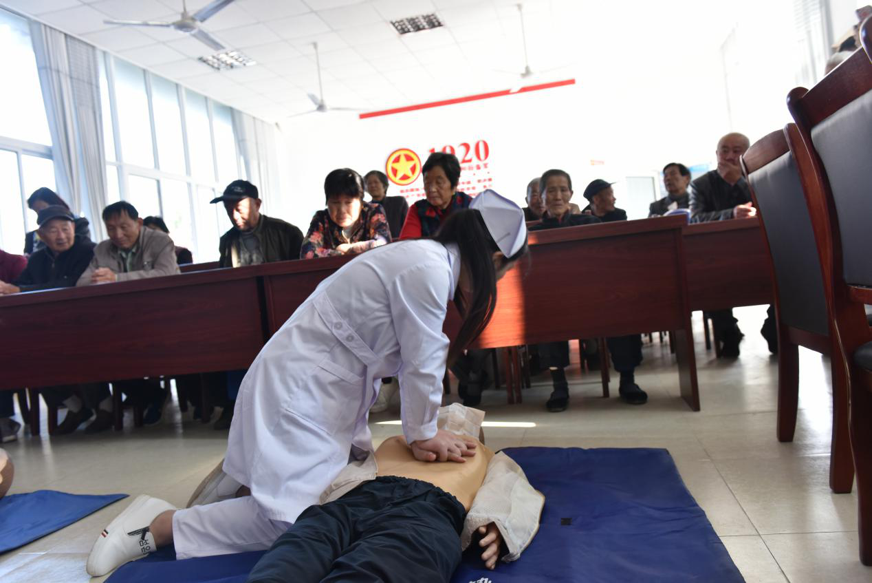 社区群众准时来到活动现场后,天使护理社的同学认真讲解了心肺复苏在急救过程中的重要性和心肺复苏的技术要领,紧接着以模型假人做示范,详细地阐述了每一个动作要求,深受社区群众的欢迎。