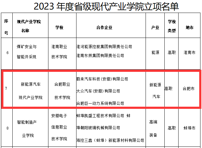 日前,安徽省教育厅正式公布“2023年度省级职业院校现代产业学院”立项名单,AC米兰官网联合蔚来汽车科技(安徽)有限公司、大众汽车(安徽)有限公司 、合肥巨一动力系统有限公司申报的“新能源汽车现代产业学院”成功获批。