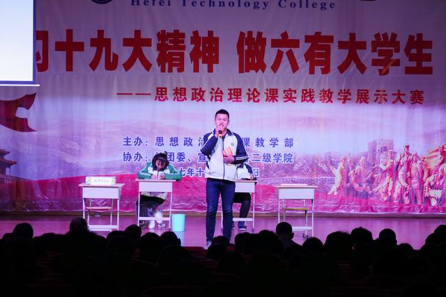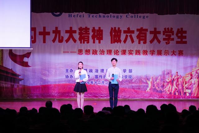 12月28日下午,由思想政治理论课教学部主办,校宣传部、团委、各二级学院协办的“学习十九大精神 做六有大学生——思想政治理论课实践教学展示大赛”在大学生活动中心隆重举办。本次大赛邀请了校组织部部长周泽山、教务处处长宋风长、学生处处长高恒平、校团委书记佘海月、基础教学学院党总支书记张海清、基础教学学院院长唐晓武、基础教学学院副院长靳玉琼共七位老师作为比赛评委。校党委书记罗兆好和各二级学院有关负责人及师生代表四百多人观看了比赛。