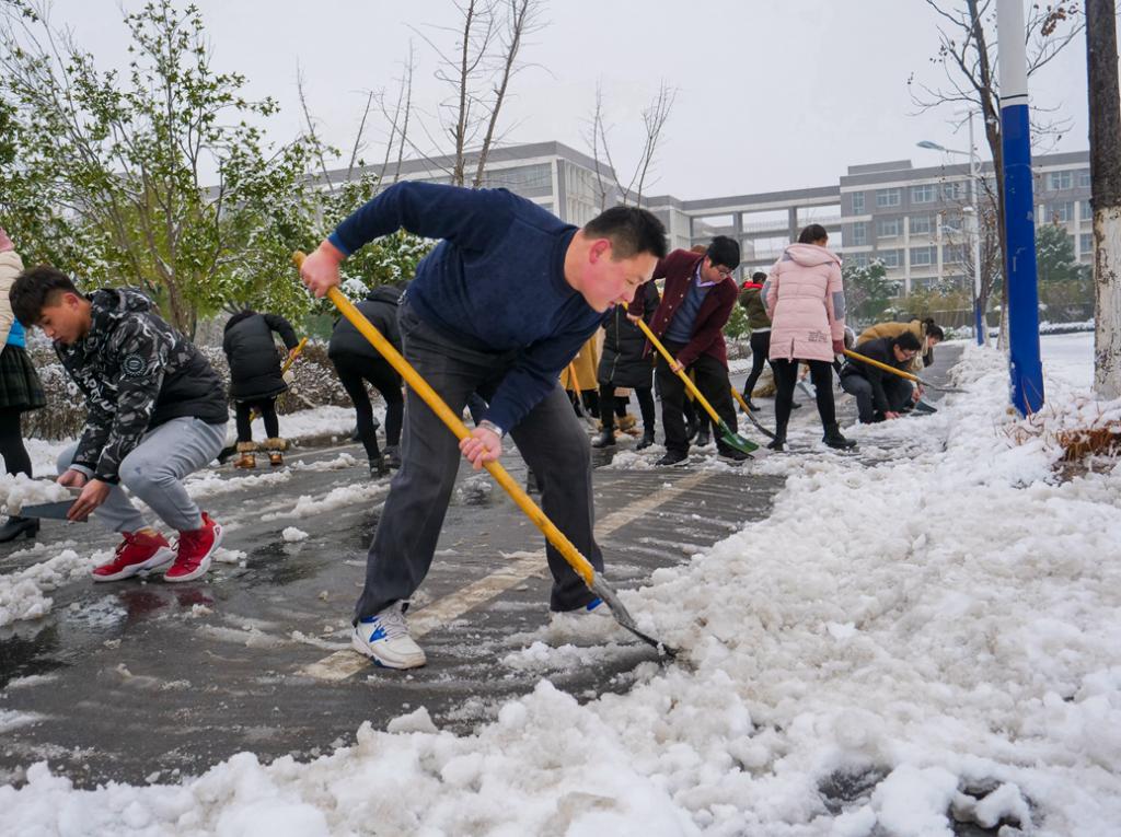 5日一早,学校全体党员、入党积极分子以及教职工志愿者开展了义务扫雪活动。学校门口、行政楼前、校内各处主干道、各二级学院办公楼下……到处都可以看到老师和同学们扫雪的身影。大家齐心协力、分工合作,很快一条条道路便被清理出来,方便了大家的出行。
