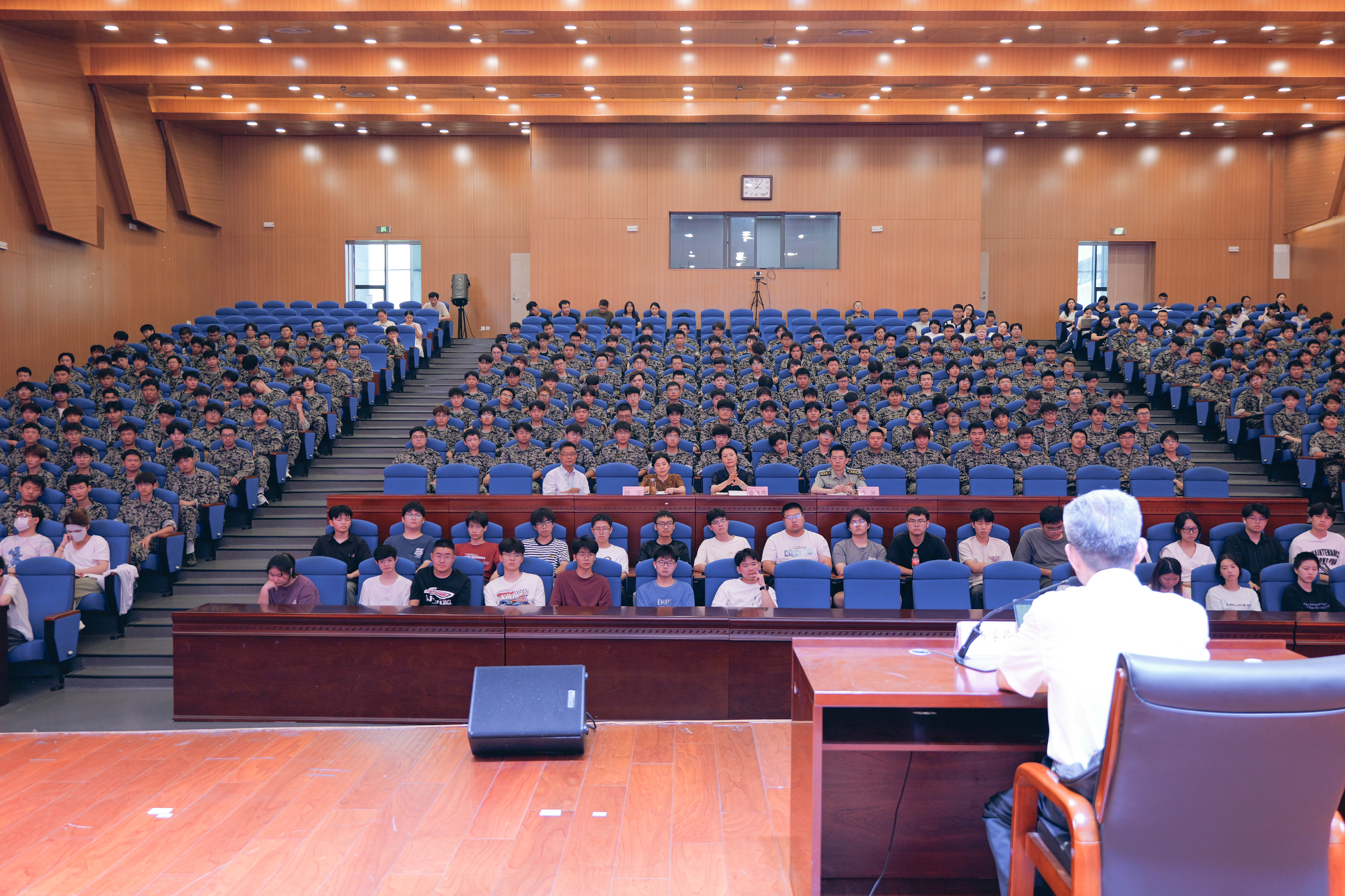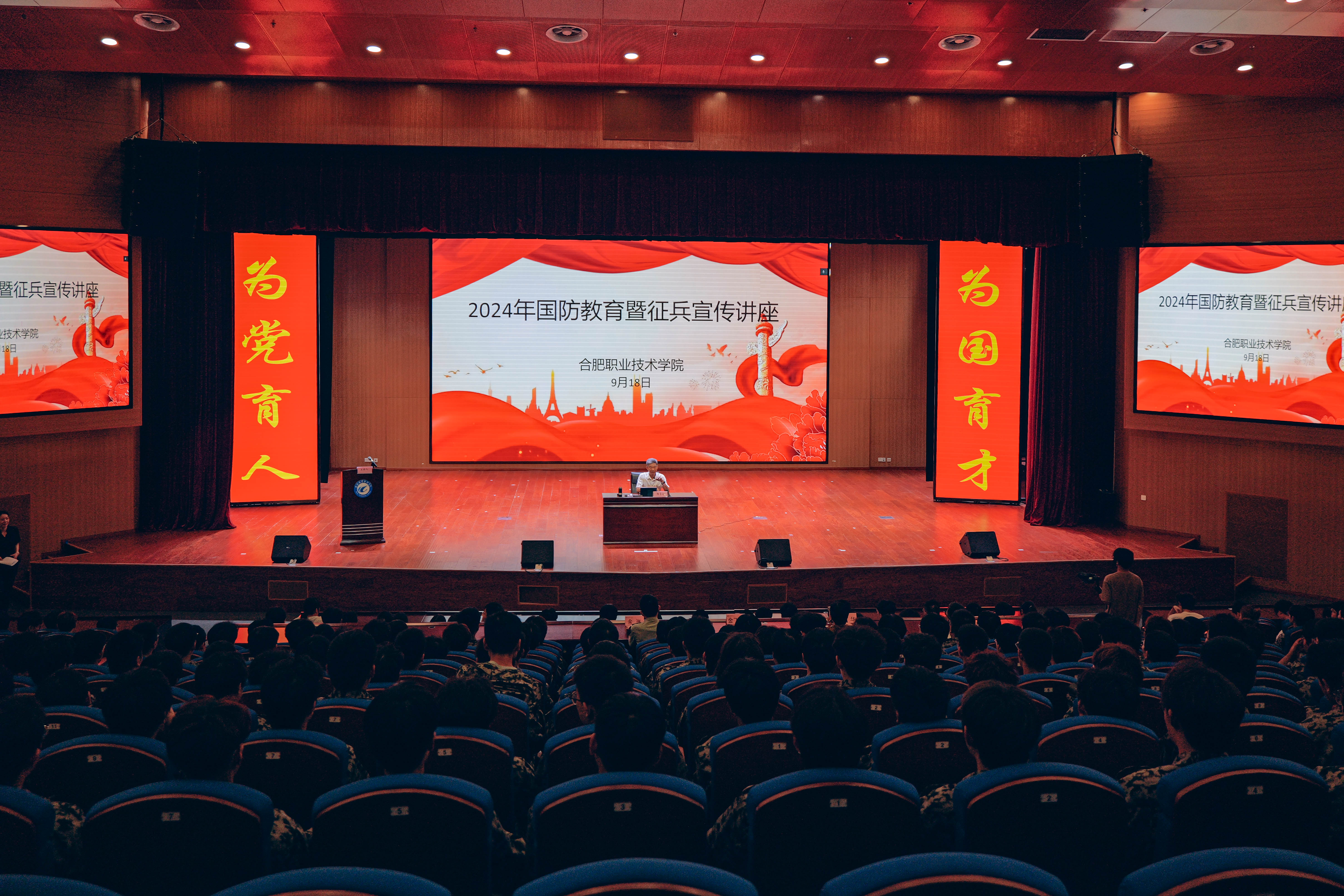 9月18日下午,山水讲堂第十二期之国防教育暨征兵宣传讲座在两校区大学生活动中心举行。活动特邀安徽省军区原副政委杨学伦少将主讲,校党委副书记金飞燕主持,巢湖市人武部政委余洲受邀参加,校党委委员、宣传统战部魏华,学生处负责人,新生班级辅导员、新生等近1100名师生参加。