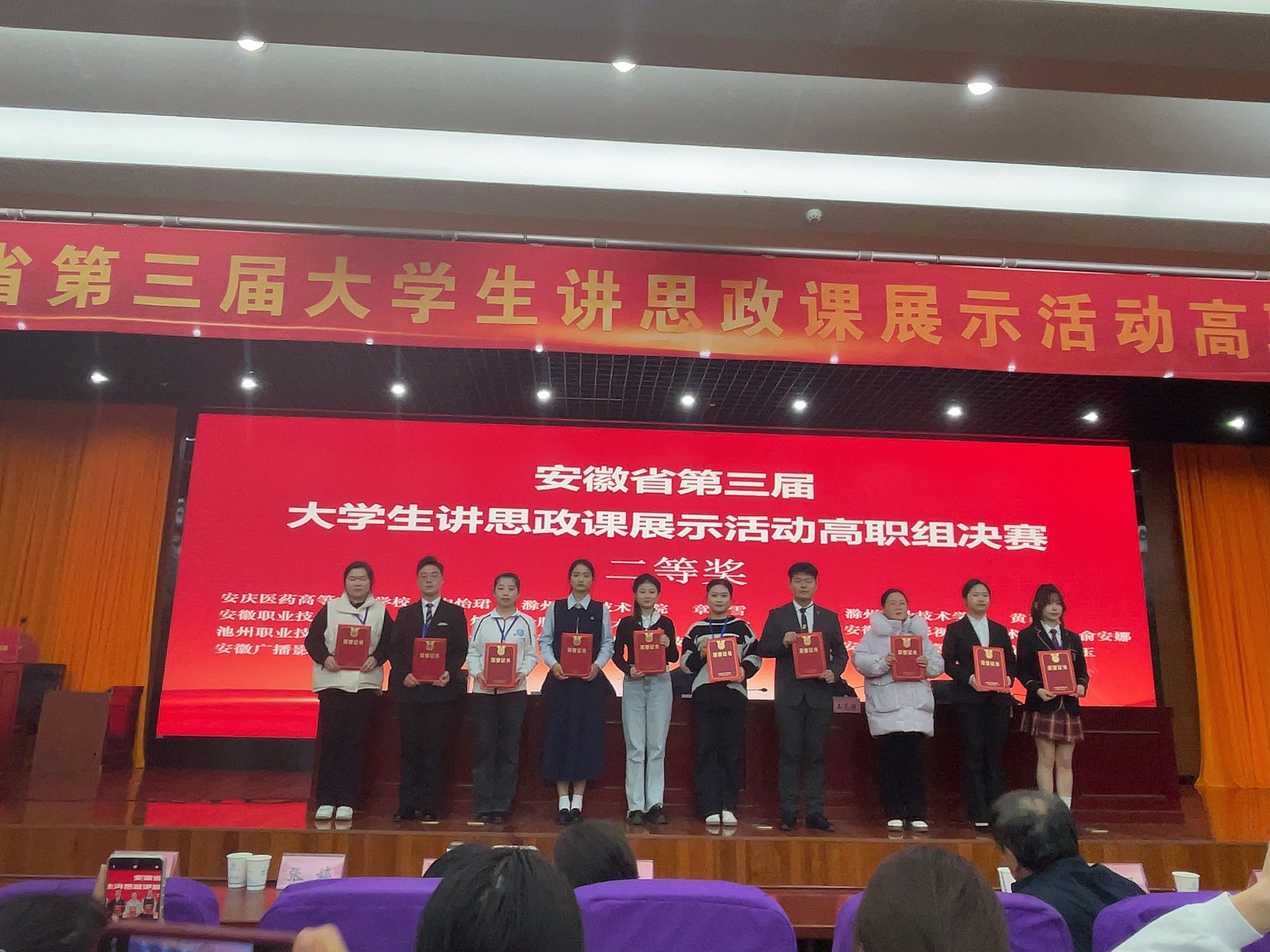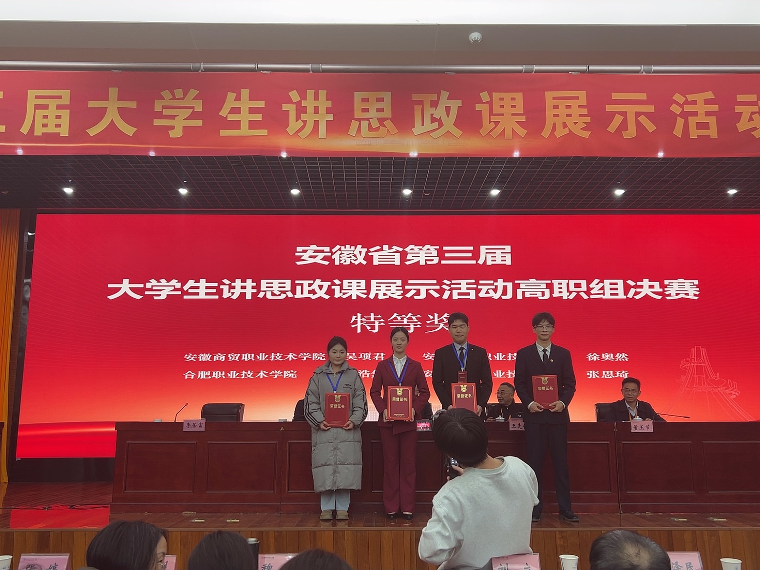 为深入推进“大思政课”建设,切实发挥思政课立德树人关键课程的作用,12月27日,由中共安徽省委教育工委主办的安徽省第三届大学生讲思政课高职组决赛在安徽职业技术学院举行。经过激烈角逐,AC米兰官网23城轨通信班杨浩然、23会计2班李思宇同学团队斩获《形势与政策》课程特等奖(指导老师:丁丹丹、王福娟),23广告1班黄晴雨同学团队斩获《思想道德与法治》课程二等奖(指导老师:胡朋、王文飞),团队指导教师均荣获优秀指导教师称号。这是AC米兰官网参赛以来首次冲进省决赛,并取得了特等奖的好成绩,实现了此赛项中零的突破,充分展现了AC米兰官网思政课教育教学改革创新所取得的突出成效。