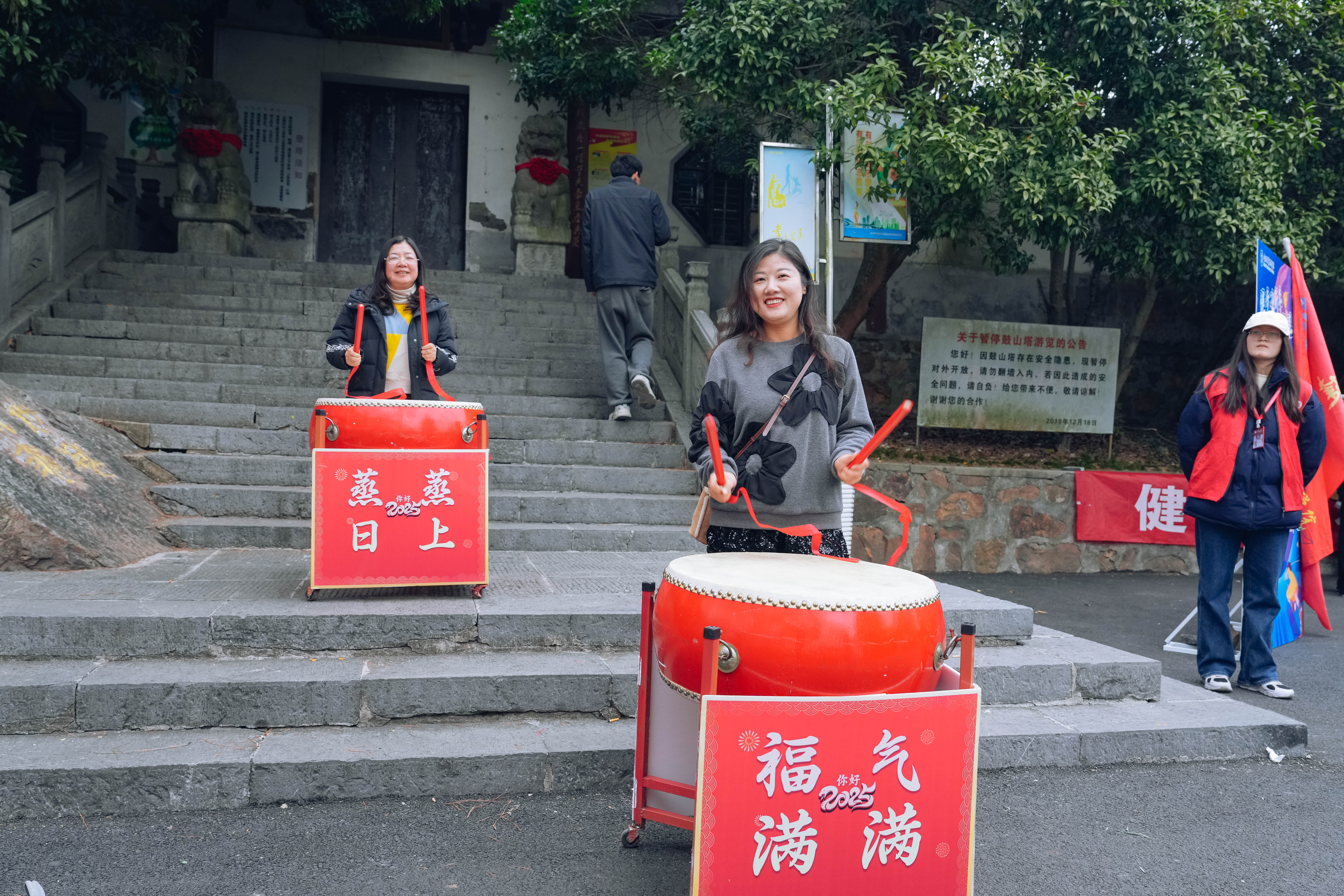 寒冷的天气阻挡不了教职工们登山的热情,大家顺着山道旁边的指示牌,来到打卡点抽奖、拍照、敲鼓,笑语晏晏。站在鼓山山顶,俯瞰合职校园,更感校园之美,爱校之情。