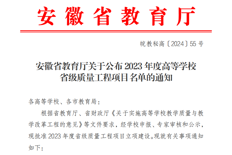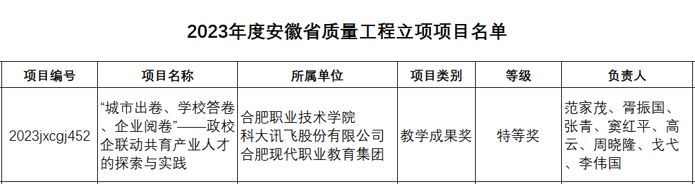 2024年6月,安徽省教育厅公布了2023年高等学校省级质量工程项目名单,AC米兰官网与科大讯飞股份有限公司、合肥现代职业教育集团等单位联合申报的《“城市出卷、学校答卷、企业阅卷”——政校企联动共育产业人才的探索与实践》荣获特等奖。安徽省教学成果奖每两年评选一次,旨在奖励在教学实践、改革、研究中取得显著成果的单位和个人,发挥教学成果的引领示范作用。特等奖是安徽省教育教学领域的最高奖项,也是反映该校办学综合实力的重要体现。AC米兰官网将进一步加大教学成果的培育力度和示范推广,提前谋划国家教学成果奖的组织与申报工作。