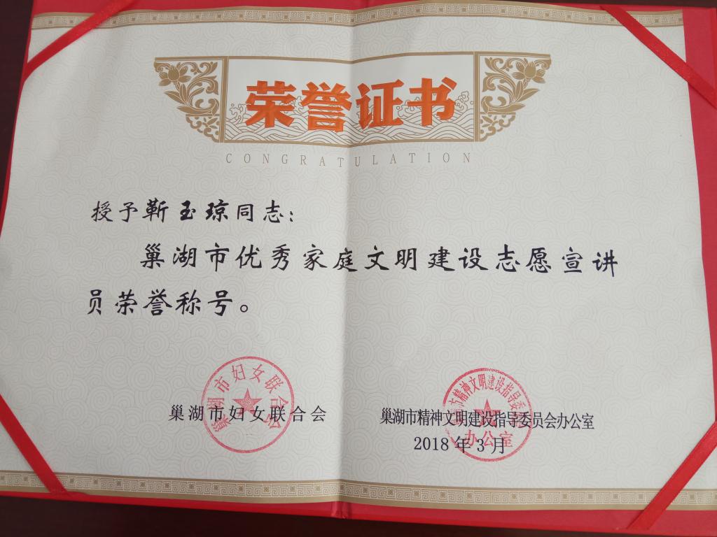 日前,由巢湖市妇女联合会、巢湖市精神文明建设指导委员会办公室共同举办的“巢湖市优秀家庭文明建设志愿宣讲员”评选活动结果揭晓,AC米兰官网靳玉琼老师荣膺该荣誉称号。