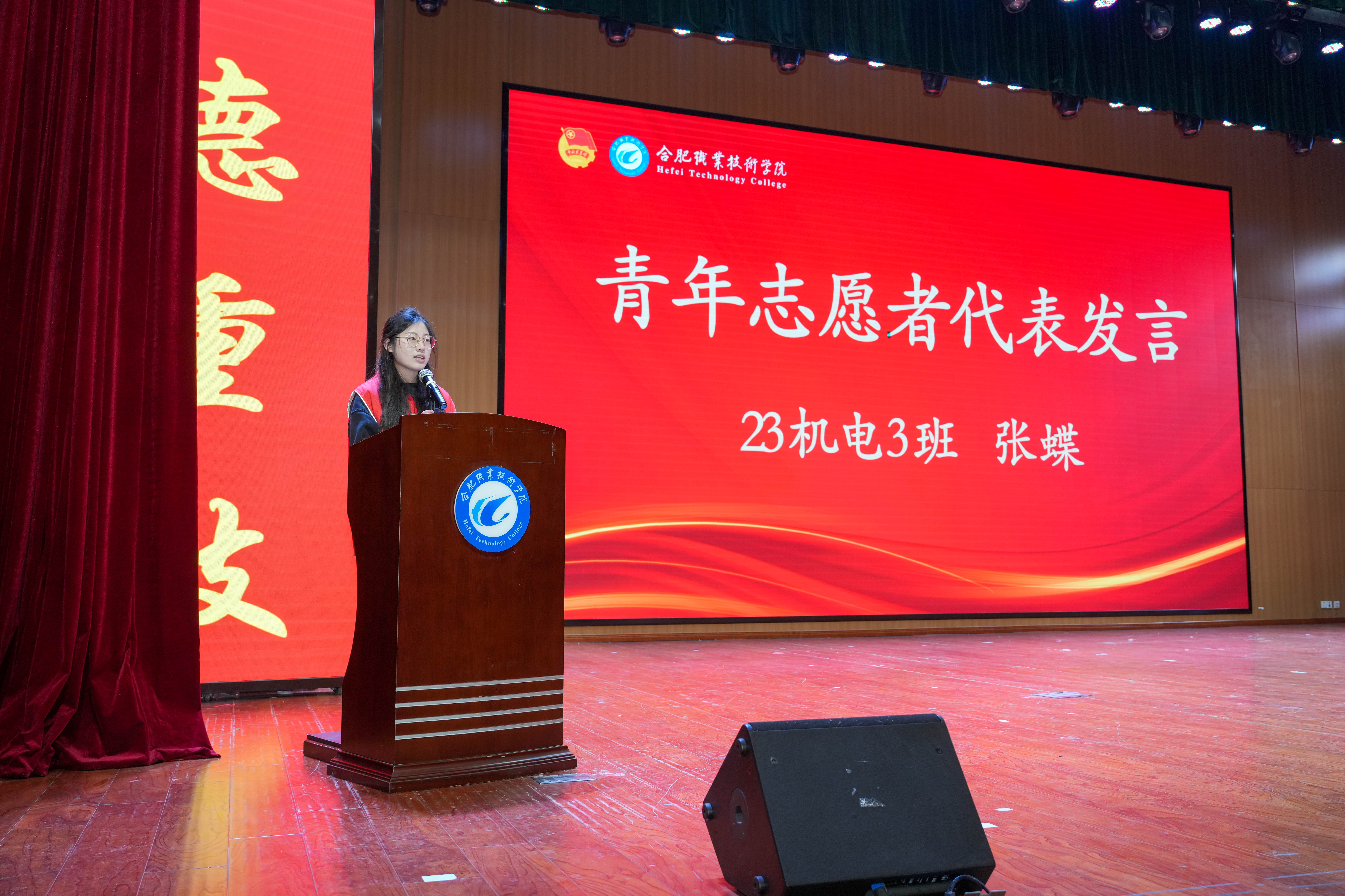 来自23机电3班的张蝶同学作为青年志愿者代表上台发言,她号召同学们以实际行动践行雷锋精神,争做雷锋精神的传承者、践行者和传播者,让雷锋精神融入日常、化作经常。志愿者宣誓环节,40名志愿者代表高举右拳,庄严宣誓,铿锵有力的誓言彰显了志愿者们弘扬雷锋精神、投身志愿服务的坚定信念。