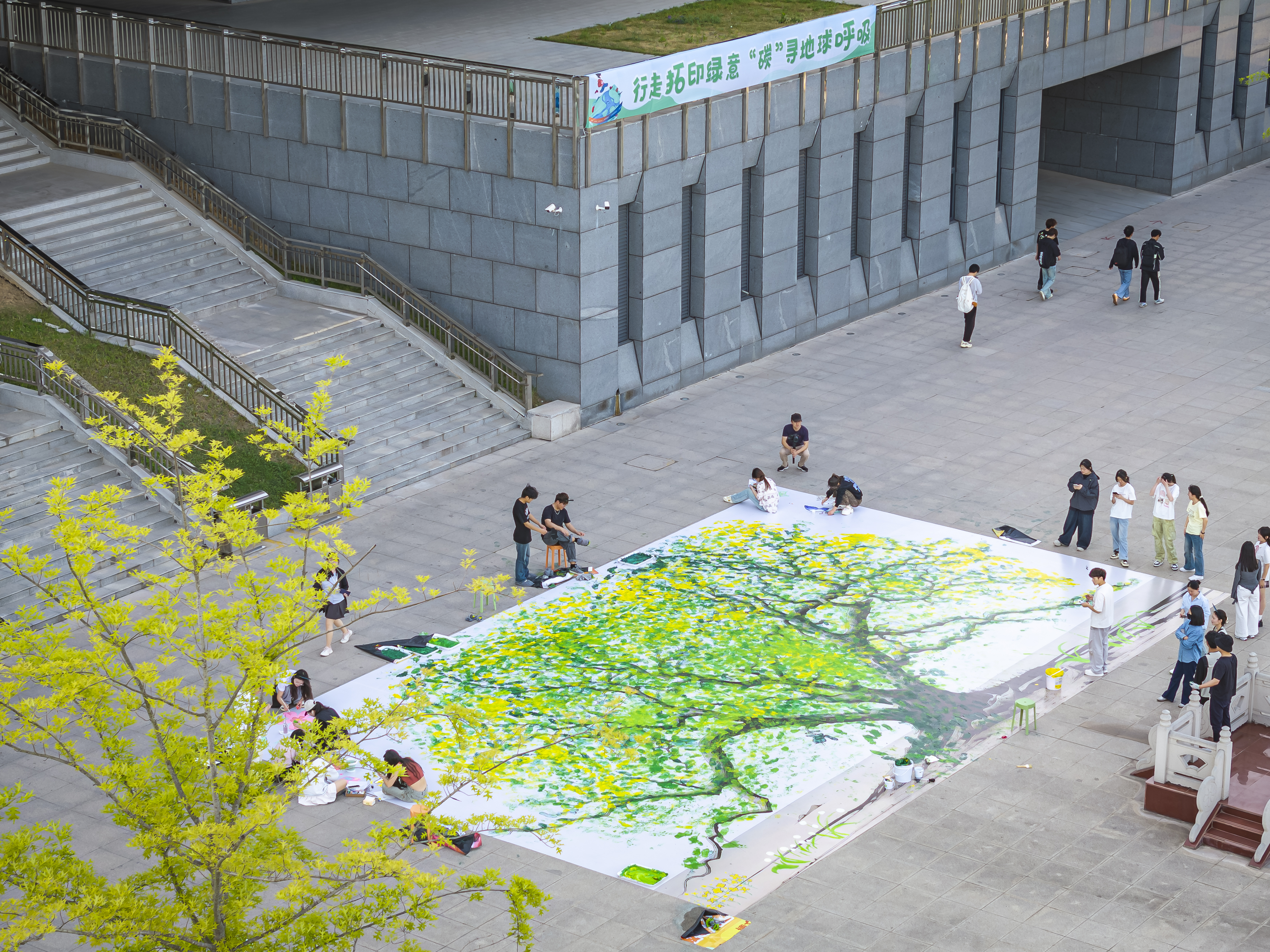 活动现场,一副巨大的的枯木绘画躺卧在校园内汇心湖畔地面。参与者们在校大学生记者站同学们的引导下有序踏上枯木,每一步都化作颜料中的一抹绿意。随着脚步的起落,深绿、浅绿、鹅黄的色彩层层晕染,枯木的纹路逐渐被生机勃勃的“枝叶”覆盖。更有同学手持画笔,在“绿叶”间点缀上粉嫩的花朵、嫩绿的小草与灵动的蝴蝶,一幅“枯木逢春”的生态画卷在足尖与笔触间徐徐展开。