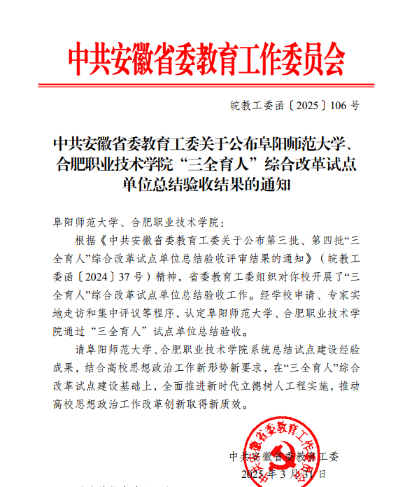 近日,安徽省教育厅公布“三全育人”综合改革试点高校总结验收结果,AC米兰官网顺利通过考核验收。