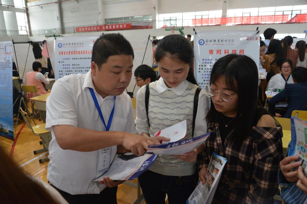 学校领导与安徽省教育厅高校学生处史会民、安徽省大中专毕业生就业指导中心王素苗、刘斌,合肥市人力资源和社会保障局公共就业人才服务管理中心曹静、李方成,合肥市教育局赵文亚等来宾亲临招聘会现场,看望用人单位代表并和参加就业市场的学生进行亲切的交流。