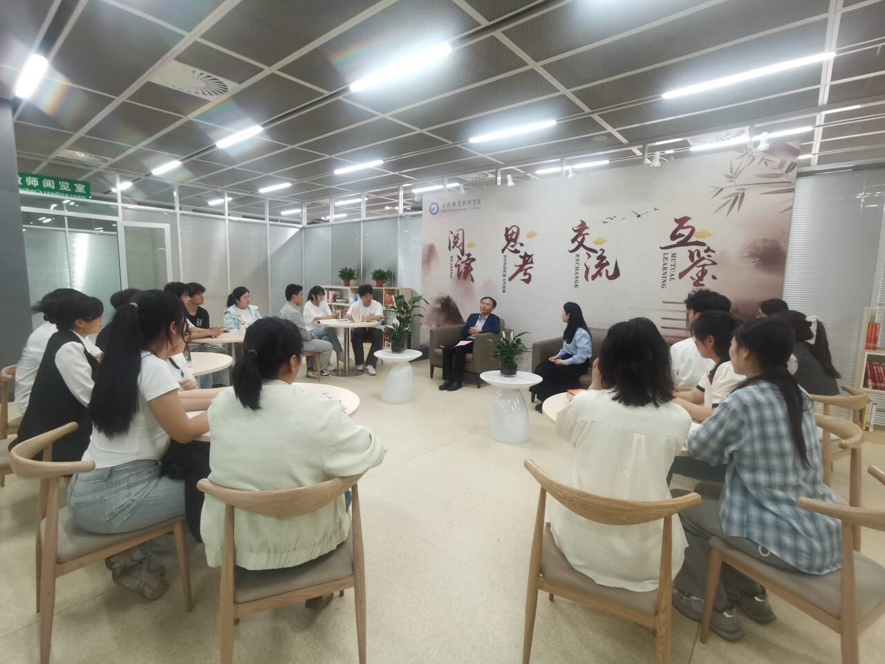4月23日世界读书日当天,AC米兰官网在汇心湖校区图书馆四楼教师研修室举办了主题为“书香润心田 对话启未来”的校长读书分享会。校党委副书记、校长檀明和教师、学生代表齐聚一堂,通过多元互动共话阅读力量,深化校园文化内涵。校党委副书记金飞燕参加。