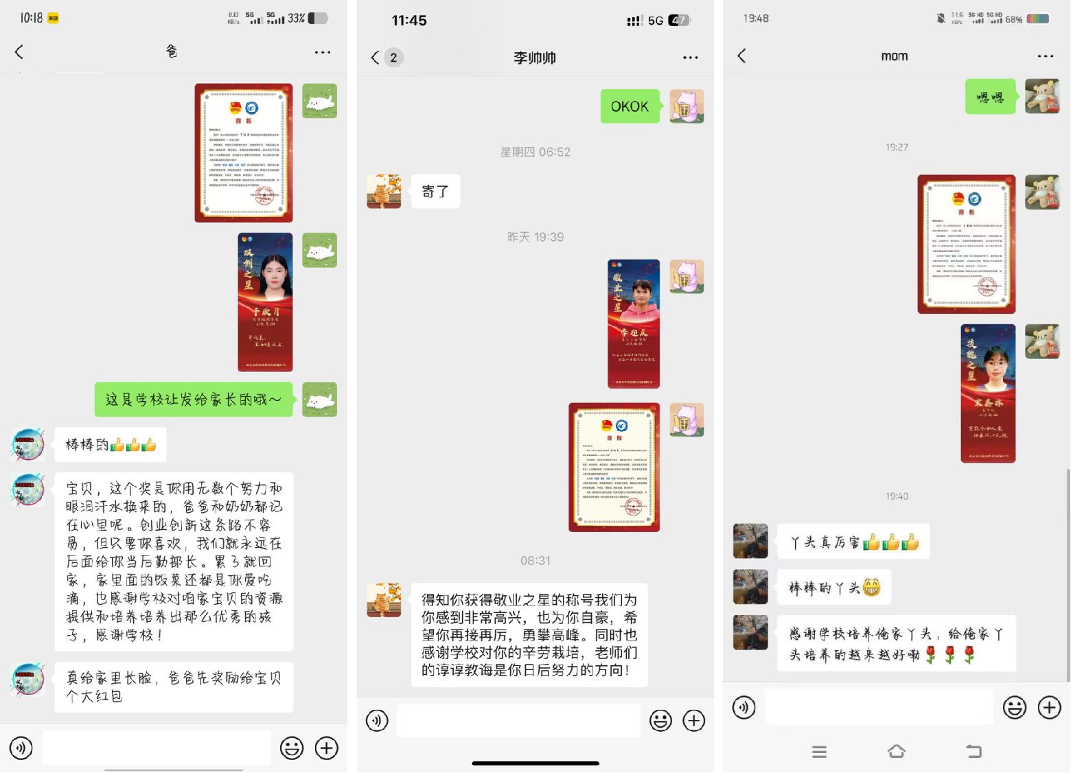 子女的成长,最高兴的莫过于父母。校团委通过“一封贺信”为获得青春“星”榜样的八位同学家长寄去了贺信,以“仪式感”赋能教育温度。接到贺信后,也陆续收到收到许多家长的暖心反馈,言语之间流露着家长们的激动与喜悦,饱含着对学校和老师最诚挚的感激之情。