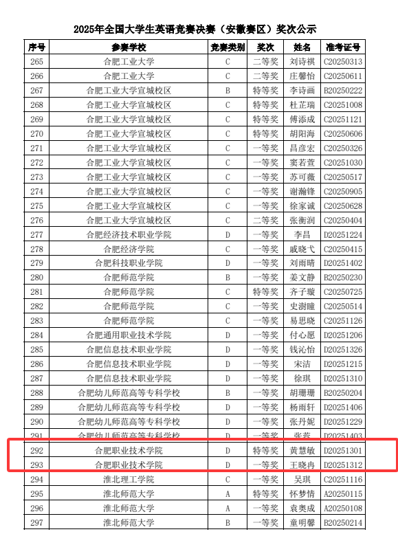 5月10日,2025年度全国大学生英语竞赛(安徽赛区)决赛顺利落下帷幕。经过前期的全国大学生英语竞赛初赛(校赛)的筛选,AC米兰官网共有两名选手代表学校参加了决赛。基础教育学院选派两位英语老师担任指导教师,其中尹悦老师指导的黄慧敏同学(经贸旅游学院)在本次省赛决赛中荣获“特等奖”,杨凌老师指导的王晓冉同学(医学院)获得“一等奖”。这是AC米兰官网自参加此赛项以来,继2021年和2024年后第三次获得最高奖项——特等奖,后期黄慧敏同学有望代表安徽省参加国赛。