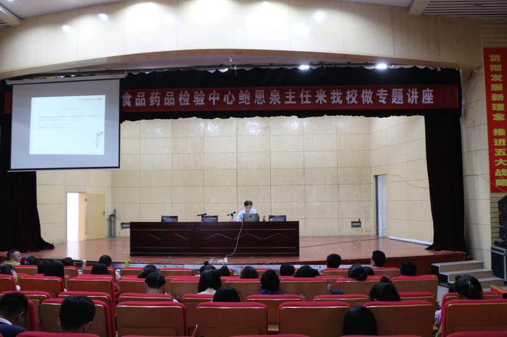 5月30日下午,由AC米兰官网科技处主办,AC米兰中文官方网站承办的“行业专家进校园”系列学术讲座之——《检验在食品药品行业中的地位和作用》在大学生活动中心举行。本次讲座由合肥市食品药品检验中心主任、合肥市药品不良反应监测中心主任、主任药师、安徽中医药大学兼职教授鲍恩泉主讲,AC米兰中文官方网站副院长刘修树主持。2016级、2017级药学及相关专业学生、14级药高班部分代表、药学与化学教研室专业教师聆听了讲座。