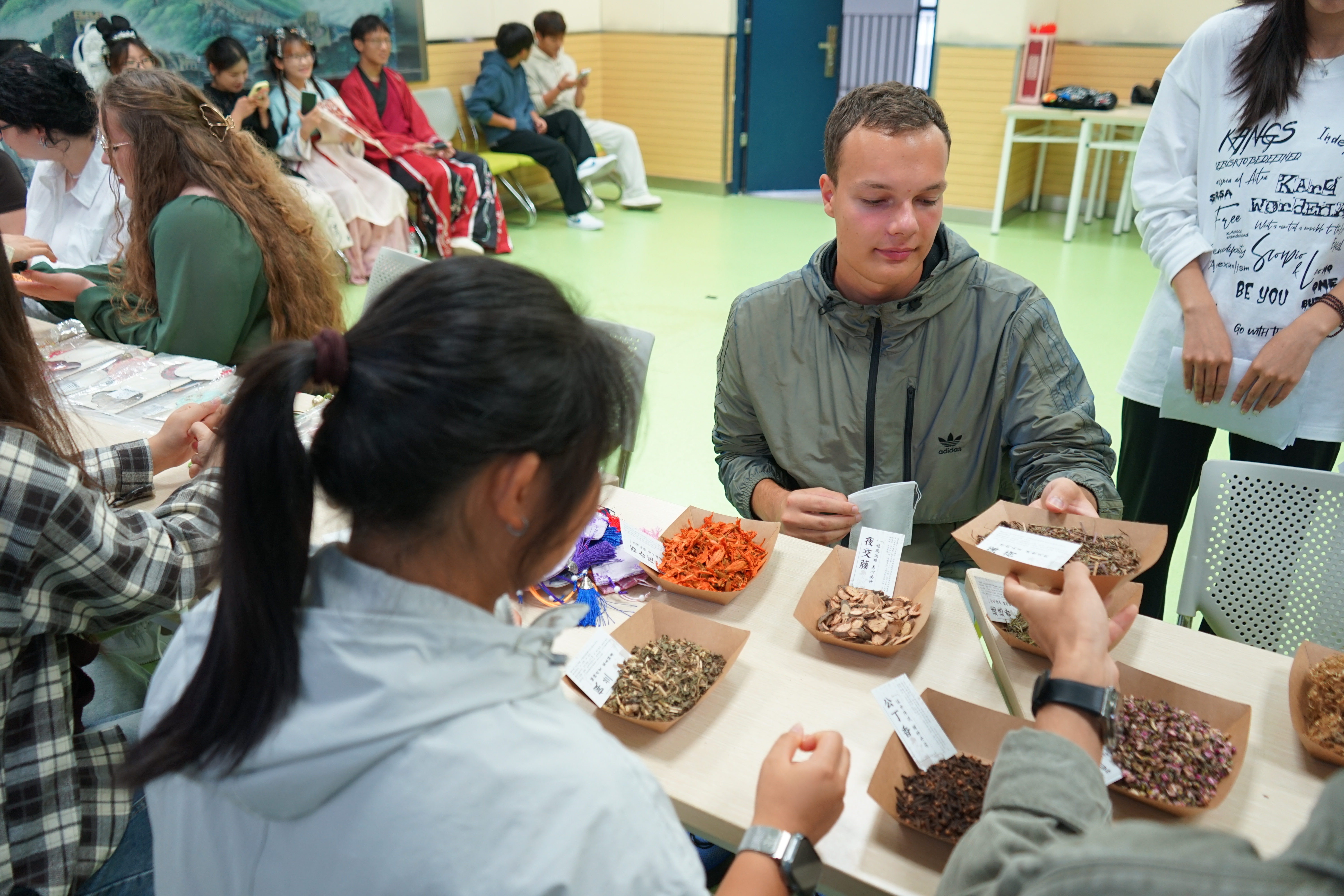 随后,师生团一行在团委负责老师带领下在汇心湖校区与非遗创艺社、雅韵汉学社、茶艺社、航模社团的同学开展了友好热烈的互动。德国师生亲身体验了我国非遗传统文化,如剪纸、非遗宋锦风铃、漆扇、油纸伞、香囊、掐丝珐琅的制作;了解不同时期汉服的特点及发展;品尝中国六大茶类,观赏茶的冲泡表演和抹茶制作;了解中国在无人机等领域的发展成就,体验了无人机组装操作。