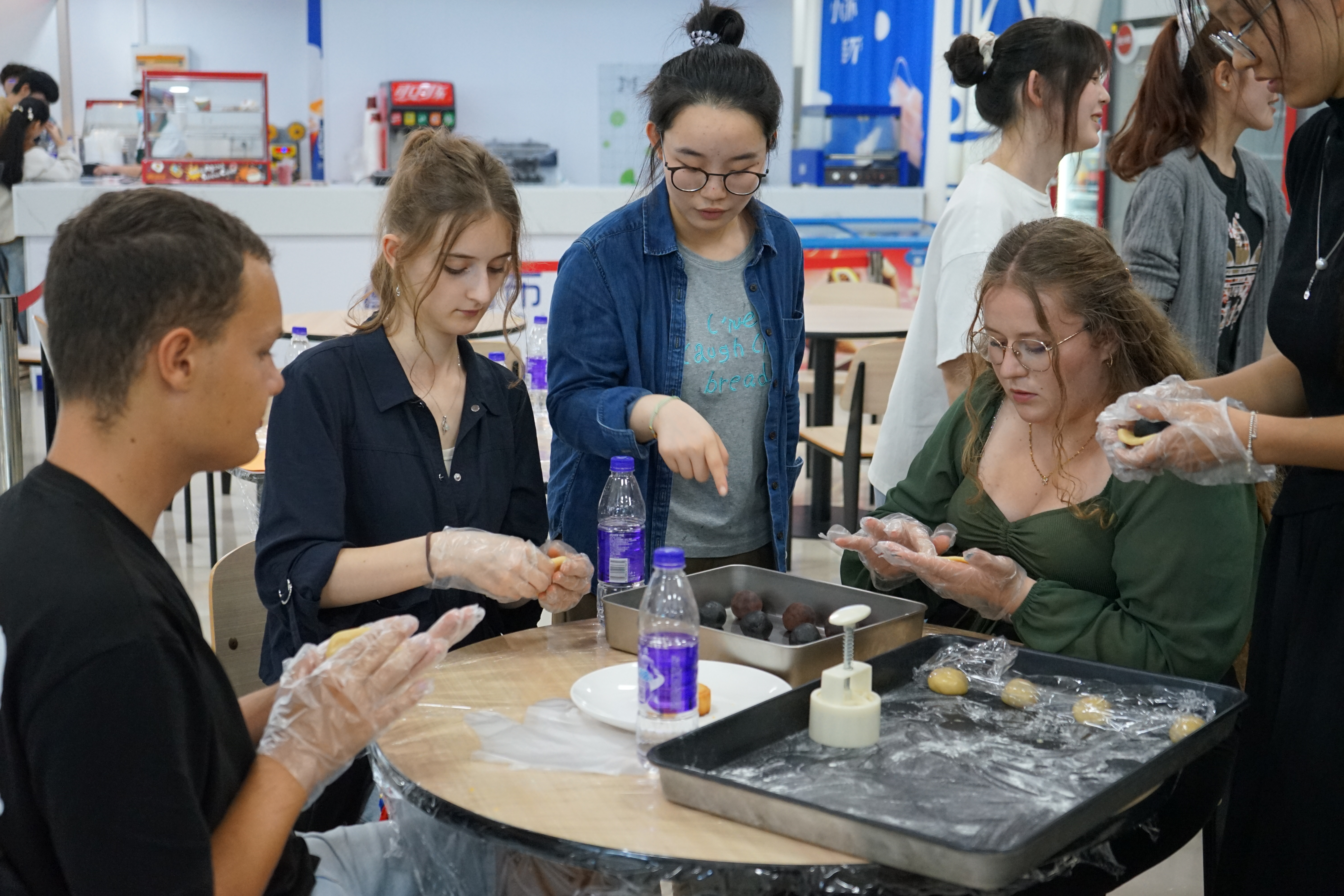 下午来访团前往鼓山校区,与兰亭书画协会的同学携手书写了“有朋自远方来不亦乐乎”等书法作品;与药海拾贝社团成员共同学习传统中药材,制作中药材冰箱贴,拓印中药材书签;最后与魔幻烘焙社的同学们一起制作品尝中秋月饼。