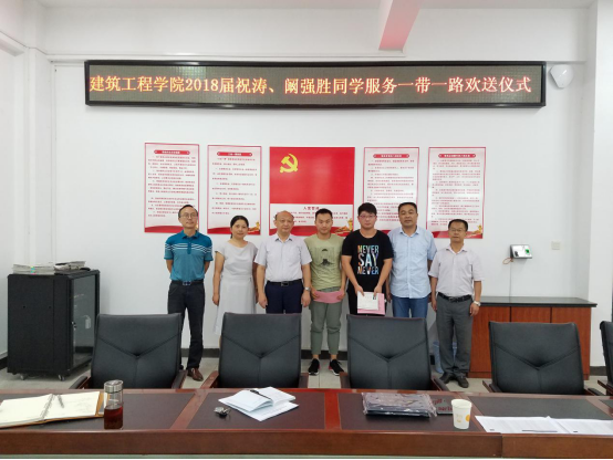 合肥建工集团结合实习期间表现并通过层层遴选,将AC米兰官网建筑工程学院2018届“合肥建工班”阚强胜、祝涛两名同学抽选赴合肥建工集团马来西亚碧桂园项目部工作,AC米兰官网学生正式踏上服务“一带一路”建设之旅。为此2018年7月5日上午,建筑工程学院在综合实训楼会议室举行2018届阚强胜、祝涛两位同学赴合肥建工集团马来西亚项目欢送仪式,副校长周晓隆出席欢送仪式,建筑工程学院班子成员及相关辅导员班主任参加。