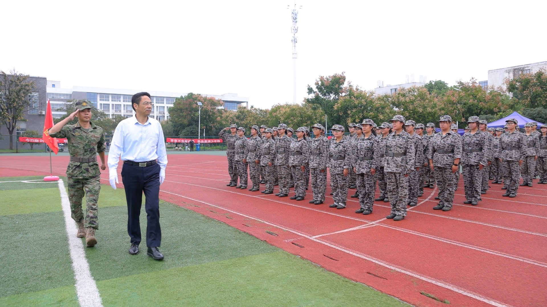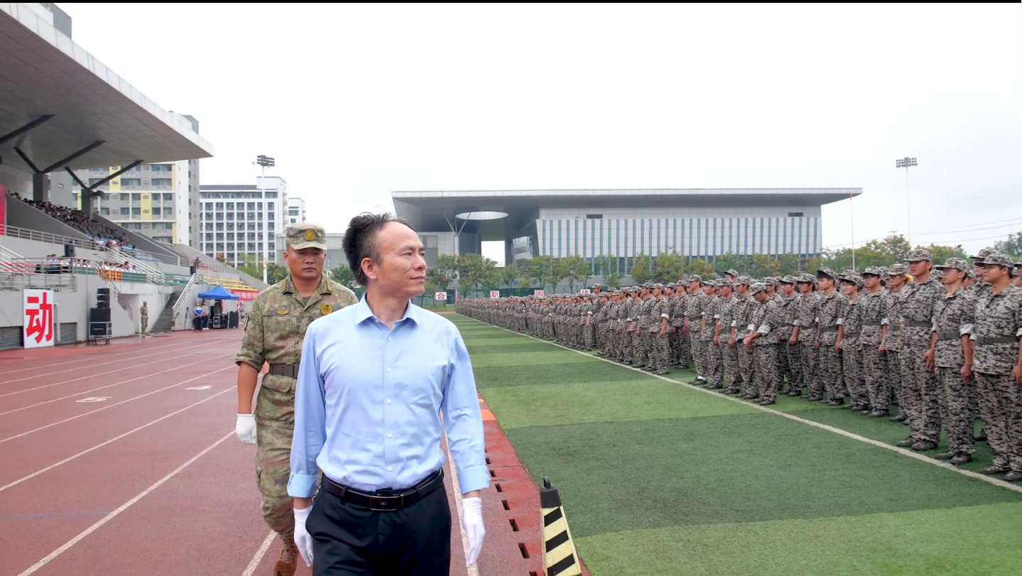 伴随着庄严的《中华人民共和国国歌》,五星红旗冉冉升起,全体人员肃立行注目礼,大会正式拉开帷幕。校党委书记王杰才、校长檀明在军训团负责人的陪同下,分别对两校区受训学生组成的方队进行检阅。