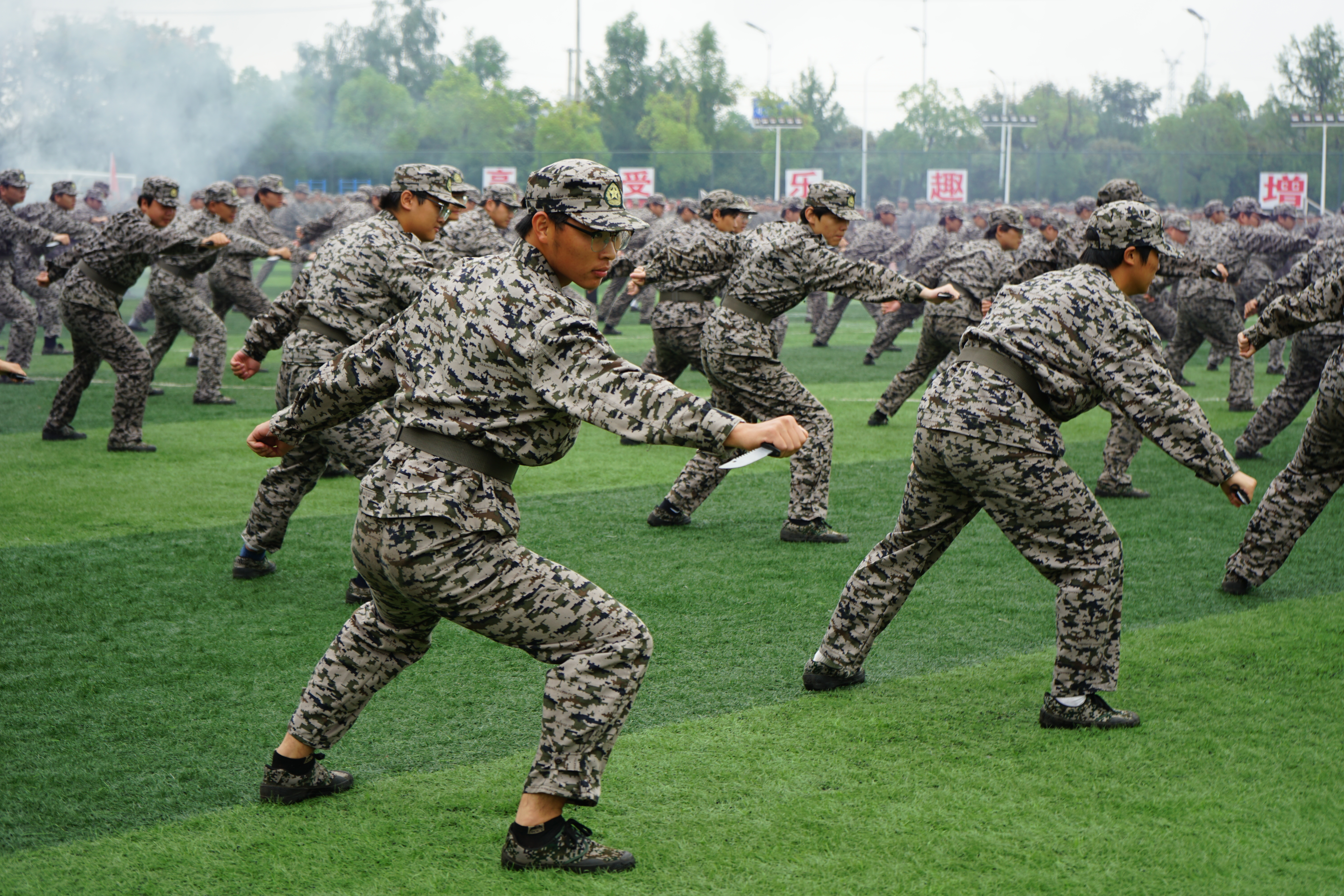 “分列式开始!”随着指令下达,各参训方队依次通过主席台接受检阅。新生们身着迷彩服,身姿挺拔如松,队列整齐划一,转体、摆臂、踏步动作精准规范,嘹亮的口号响彻全场,充分展现出合职学子经过军训锤炼后的坚毅风貌与协作精神。分列式展示之后,还进行了拳术、战术、格斗术、捕俘刀、匕首操、献礼新中国76周年华诞表演等方阵的展示。