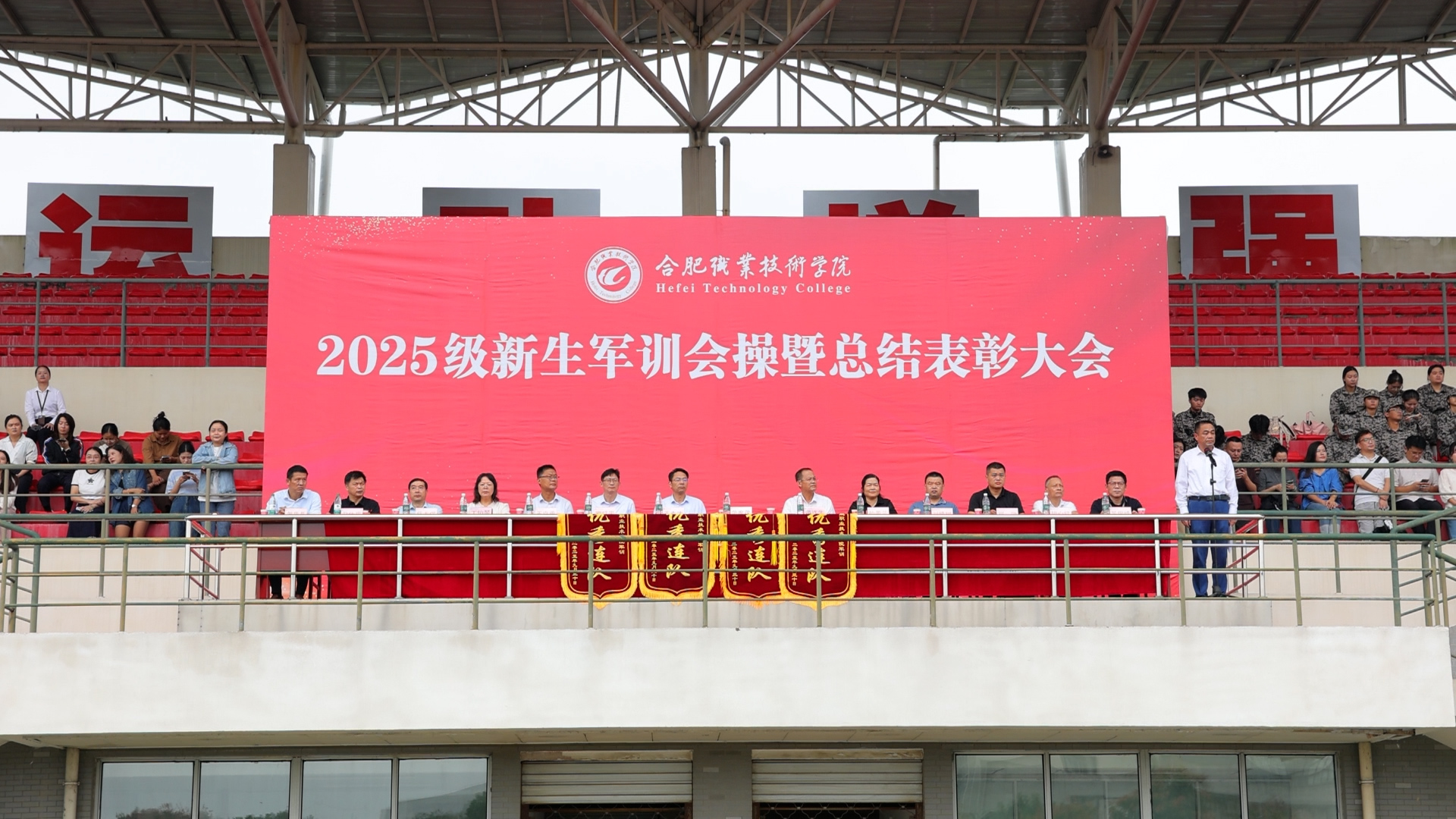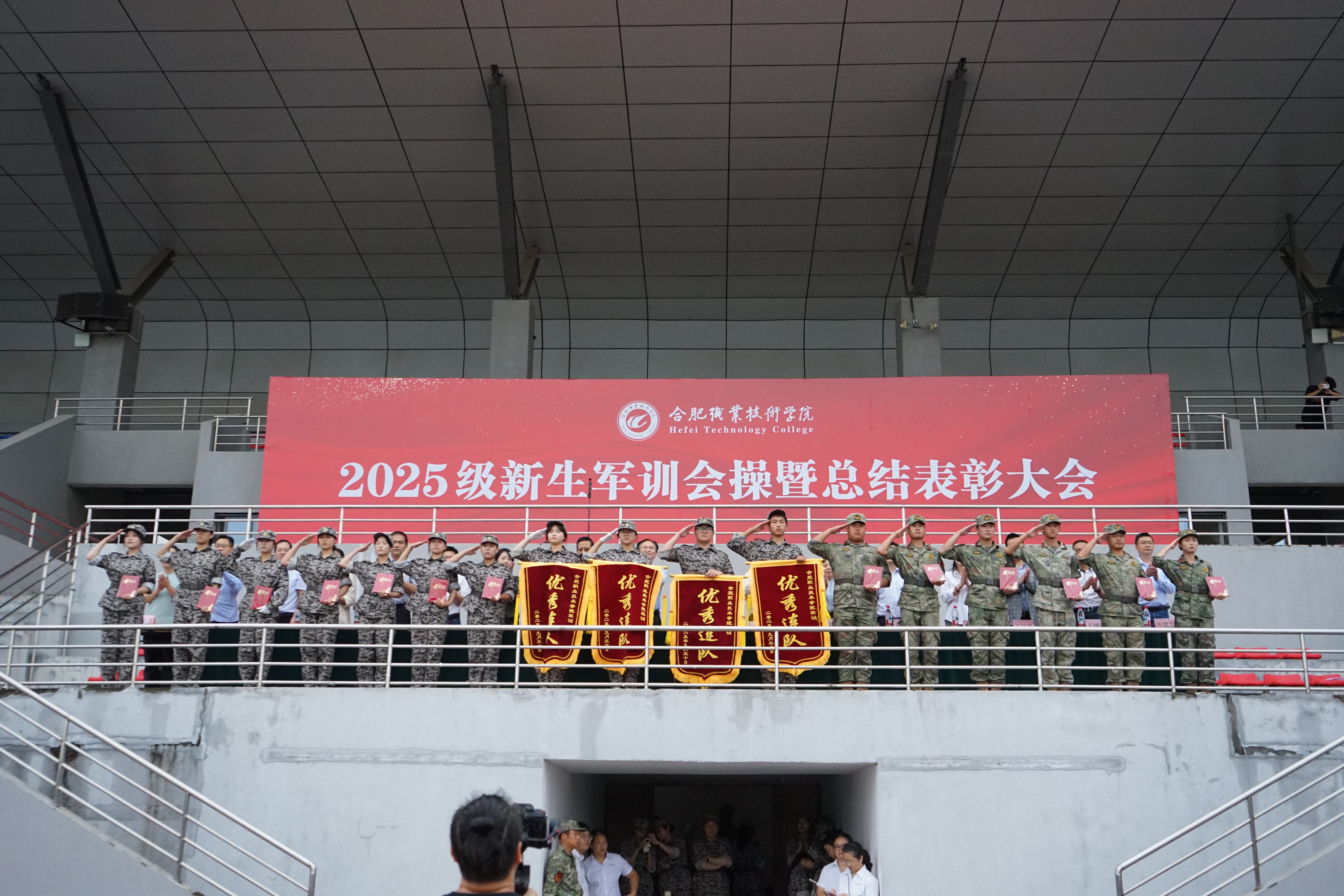 表彰环节中,校党委委员、纪委书记何军,校党委委员、办公室主任窦红平宣读了《关于表彰2025级学生军训先进集体、优秀学员的决定》,通报了“优秀连队”“优秀教官”“优秀指导员(辅导员)”和“优秀学员”等四项获奖单位及个人名单。与会领导和嘉宾为获得表彰的集体和个人代表进行颁奖。
