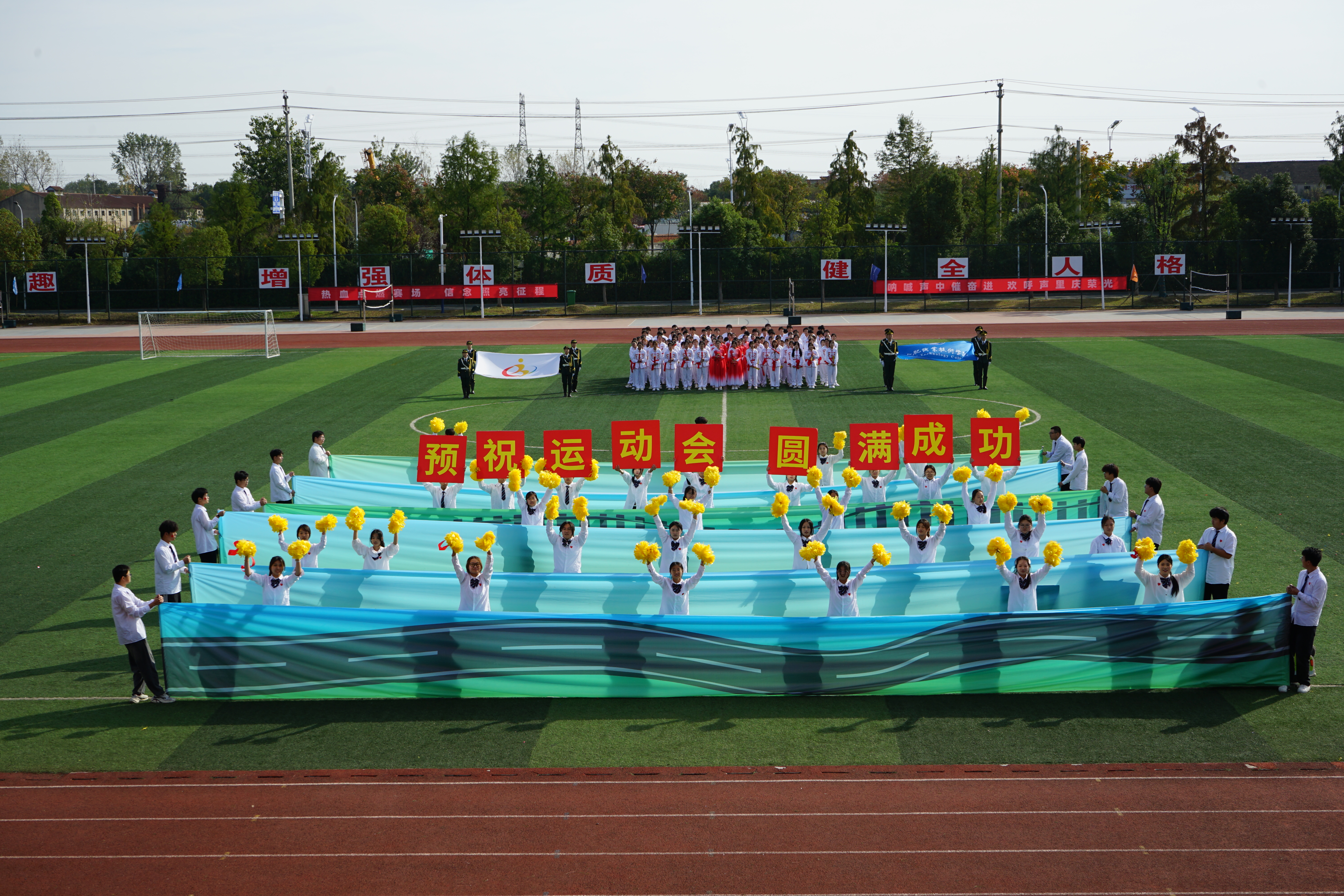 激昂的运动会音乐在汇心湖校区田径运动场上空悠扬回荡,队员们身着统一服饰,步伐整齐划一、铿锵有力,嘹亮的口号裹挟着青春朝气响彻赛场。随后,汇心湖校区各二级学院学子轮番登场,带来极具专业特色的创意方阵表演:机电工程学院学子身着藏蓝色工装服,将机械操作的利落动作与舞蹈的灵动韵律巧妙融合,刚柔并济的表演尽显工科专业魅力;信息工程与传媒学院以“我爱合职”为主题,通过灵动舞蹈搭配色彩鲜明的字母造型,用鲜活创意传递对学校的深厚情感;经贸旅游学院则以“情景剧+舞蹈”的融合形式,生动再现直播现场、会计实务操作等专业场景,让观众直观感受学科特色;汽车应用与轨道交通学院学子手持形似地铁的特色横幅,搭配轻松欢快的舞蹈,鲜活展现专业领域特点。