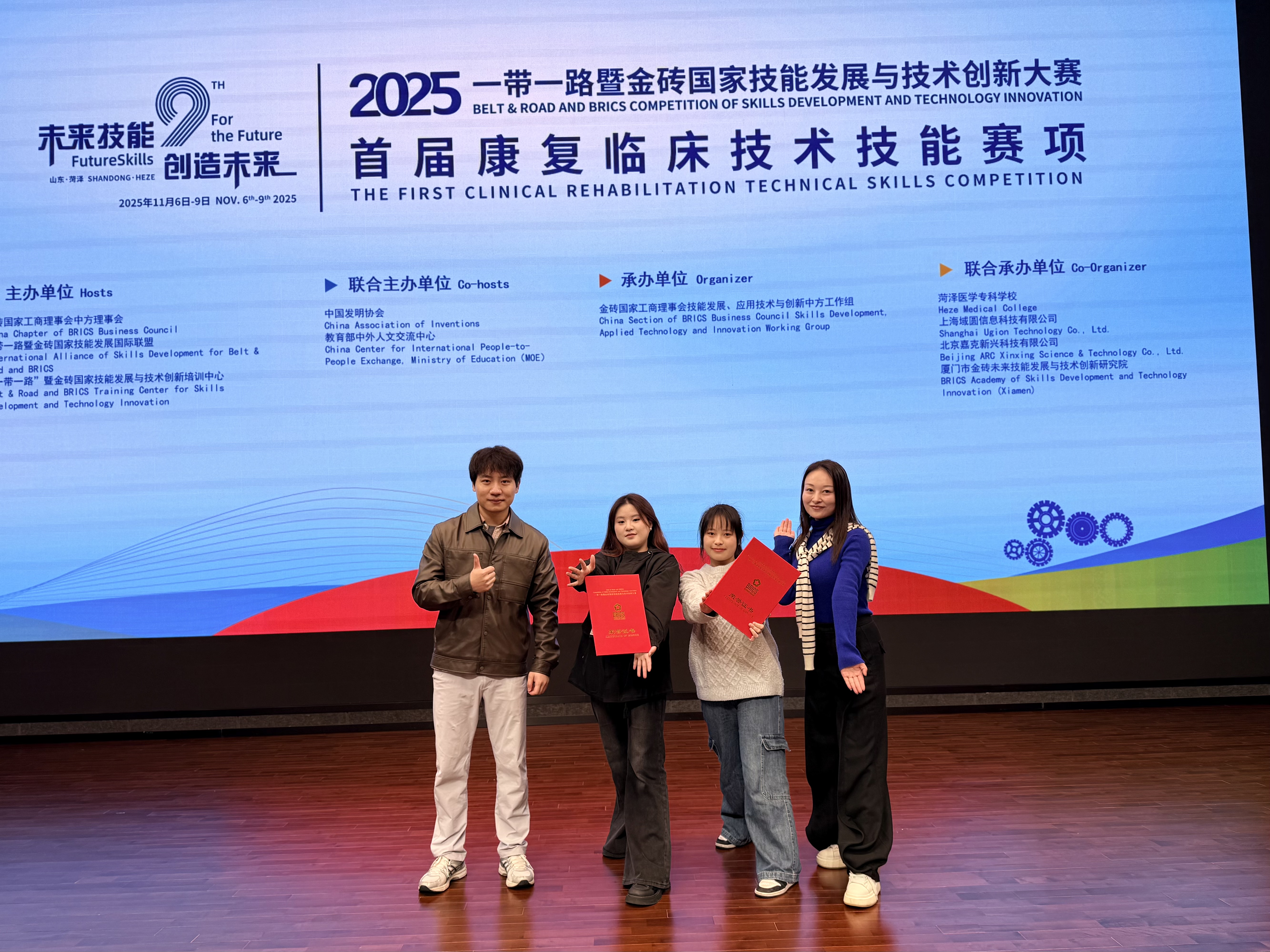 11月9日,2025一带一路暨金砖国家技能发展与技术创新大赛之首届康复临床技术技能赛项在菏泽医学专科学校圆满落幕。AC米兰官网康复治疗技术专业学生柏家园、周奕组队在全国46支高职组参赛队伍的激烈角逐中脱颖而出,凭借扎实的专业功底和出色的实操能力斩获高职组一等奖,指导教师杨万琪、甘琴荣获“优秀指导教师”称号,学校被大赛组委会授予“最佳组织奖”,充分展现了AC米兰官网康复治疗类专业的教学实力与人才培养质量。