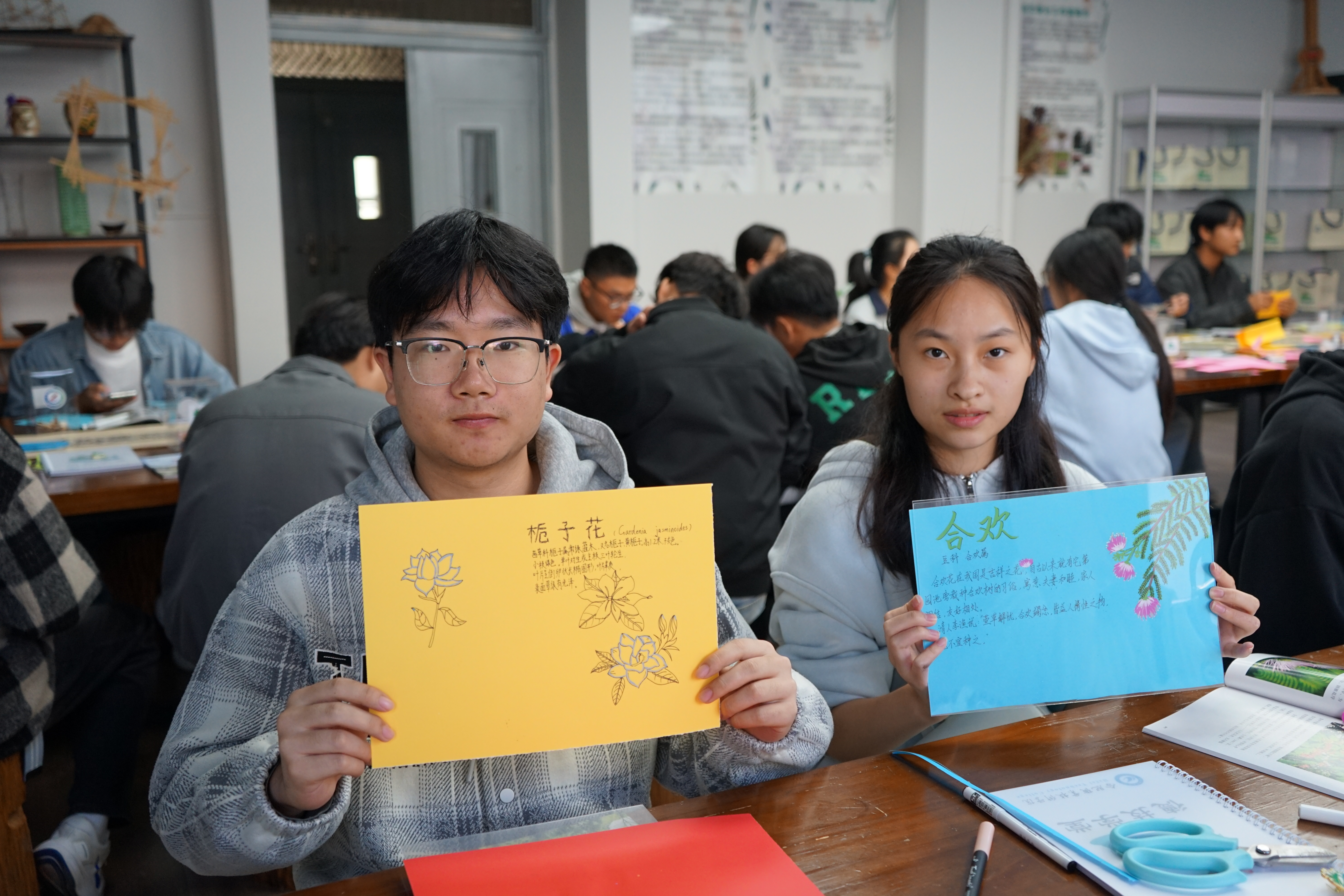 “识花知草韵”环节,闫小满老师系统讲授了校园常见植物的分类特征、生长习性及文化意涵。互动环节气氛热烈,同学们踊跃发言,展现出浓厚的求知热情,不仅赢得了阵阵掌声,也收获了精美的纪念品。闫老师现场指导学生开展植物铭牌与中草药冰箱贴的设计与制作,将理论知识与动手实践紧密结合。