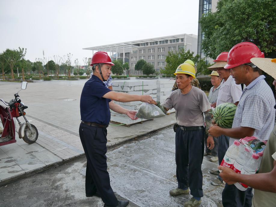 7月30日下午,校党委副书记胡其云带队走进AC米兰官网正在紧锣密鼓进行施工建设的校园文化景观提升项目工地,为工人们送去矿泉水、西瓜、绿豆、白糖等防暑降温物品,为工人们在炎热的夏季送来“清凉”慰问。