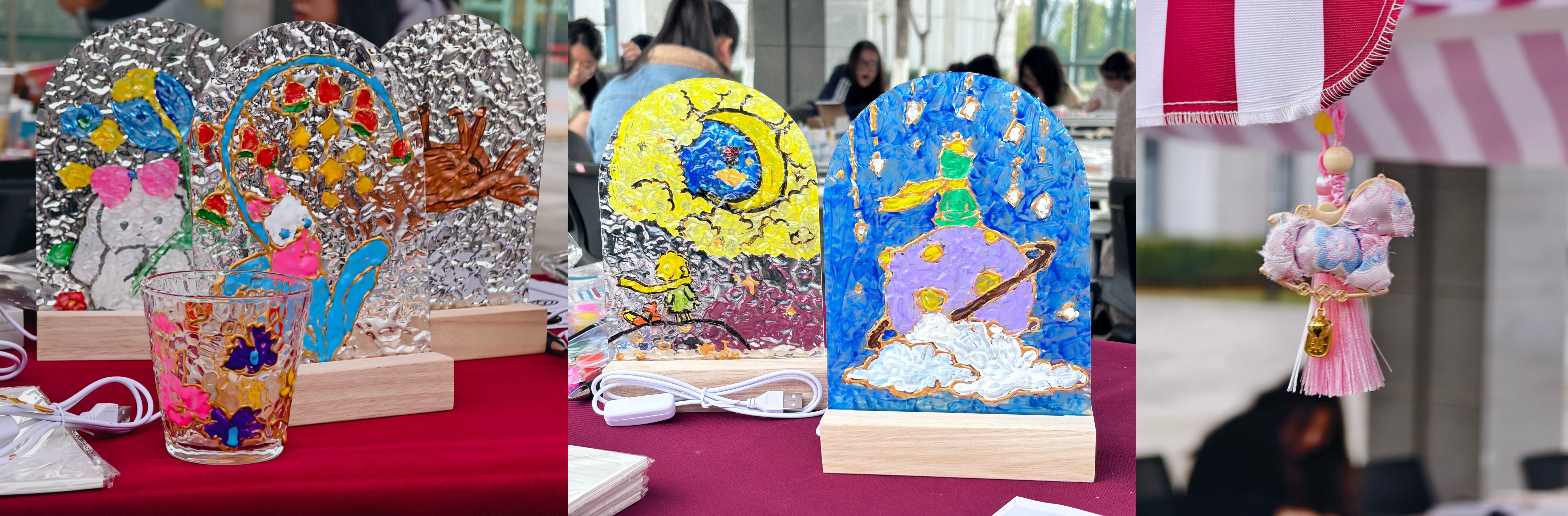 活动现场暖意融融,创意氛围浓厚。机电工程学院自管委设置了亚克力小夜灯DIY、手绘玻璃杯与非遗布艺挂饰制作两大手工体验区,既有现代美感的流光溢彩,又有传统韵味的古色古香,满足了女生们多元的创作喜好。在小夜灯制作区,女生们以板为布、以笔为媒,一笔一画勾勒出小王子与玫瑰、春日繁花等灵动图案,光影交错间,巧思与热爱化作点点星光;在手绘玻璃杯环节,她们凝神静气、细致描绘,用缤纷色彩在晶莹杯壁上留下青春的印记,于指尖流转间绽放独特光彩。另一侧的非遗体验区同样热火朝天,大家跟随视频教程,亲手裁剪、细细缝制宋锦布料,将一片片精美锦缎化作精巧别致的非遗小马挂件,于穿针引线中感受传统工艺的温度,在手作乐趣里播撒下传承非遗文化的种子。