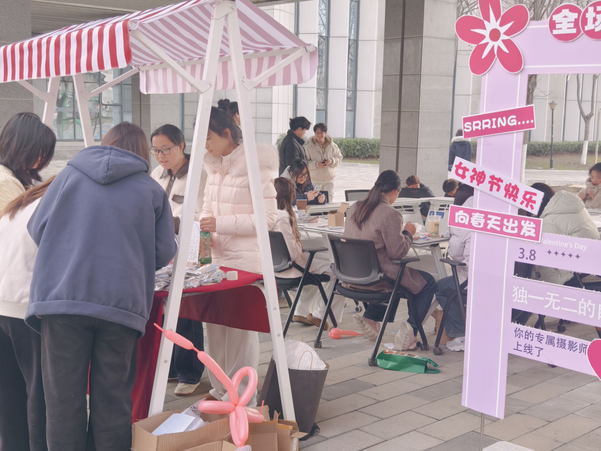 除了手作体验,现场还精心布置了“全场最佳”“向春天出发”主题打卡区。精致的相框搭配暖心标语,错落有致地装点着活动现场,成为春日校园里一道亮丽的风景线。完成作品的女生们手持独一无二的手工作品驻足拍照,盈盈笑脸与手中佳作交相辉映,定格了节日的喜悦,也展现了机电女性自信昂扬、温婉灵动的精神风貌。