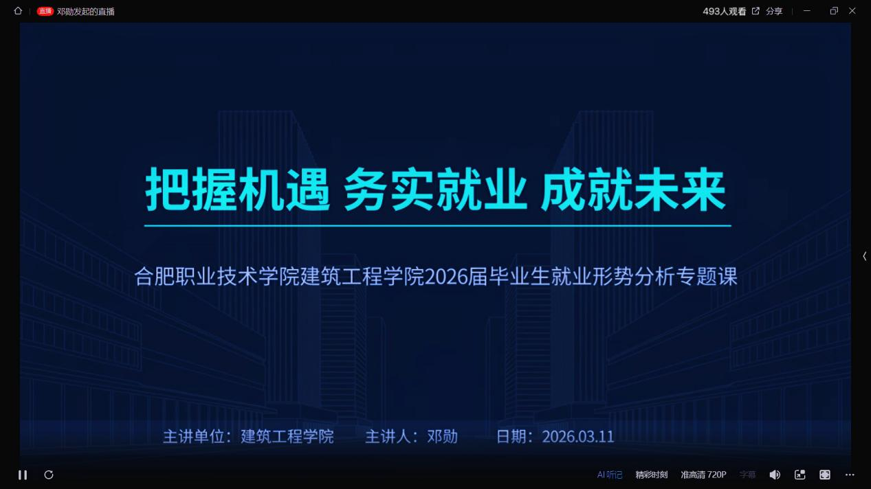 为应对建筑行业深度转型新形势,助力2026届毕业生平稳、优质就业,3月11日晚,建筑工程学院举办2026届毕业生就业形势分析专题直播课。该院副院长邓勋担任主讲,围绕行业趋势、求职路径、能力提升等问题,为毕业班学子拨开就业迷雾、明晰前行方向。
