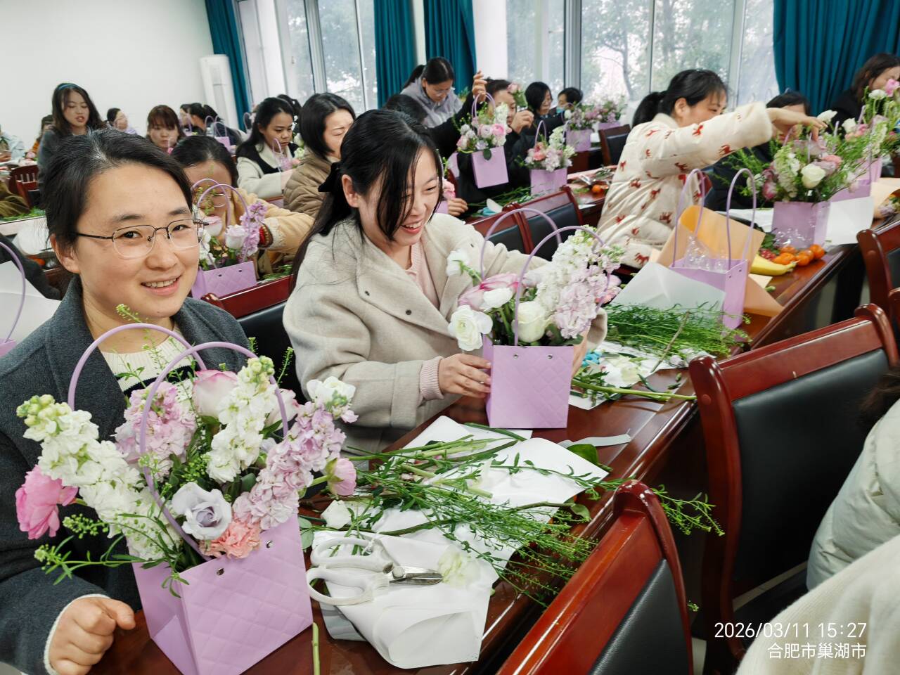 在轻松愉悦的氛围中,女教师们走下三尺讲台上,放下科研攻关难题,兴致盎然地投入到创作中。大家手持剪刀,精心挑选玫瑰、洋桔梗、康乃馨等花材,从构思造型到搭配色彩,从修剪枝叶到固定花束,一步步将普通的花材变成了一件件错落有致、清新雅致的花艺作品。会议室里花香四溢,笑语连连,春日的鲜活意趣与生活的温柔诗意交融相生,每一件作品都承载着大家对生活的热爱。
