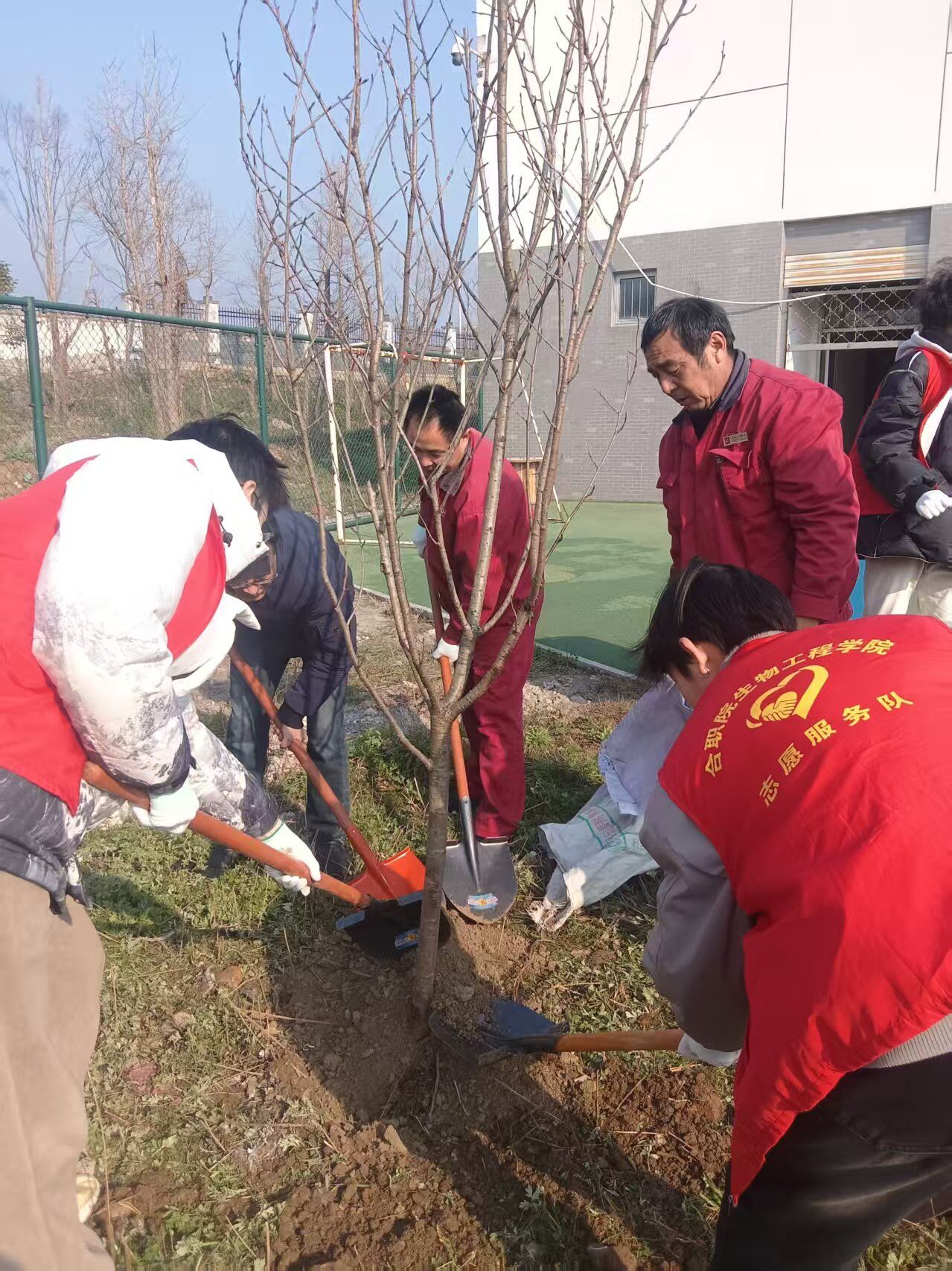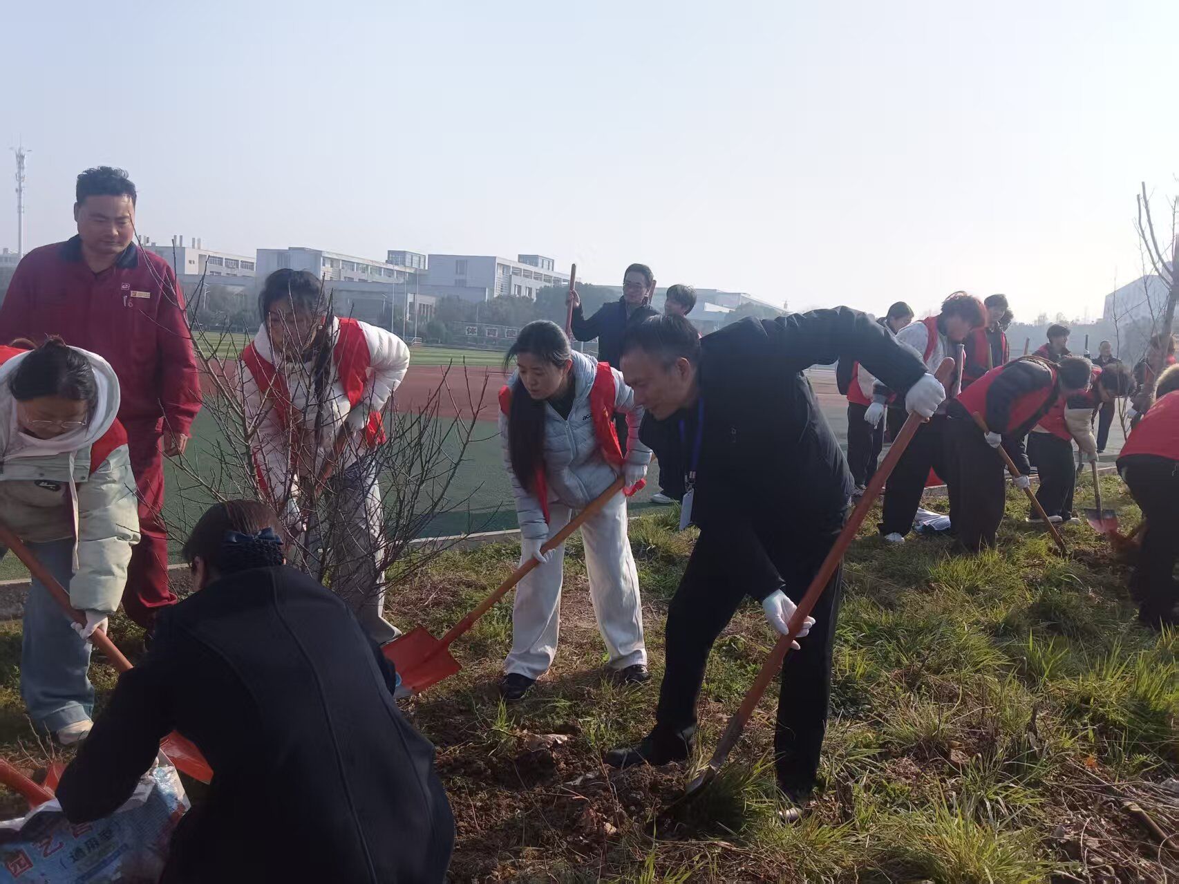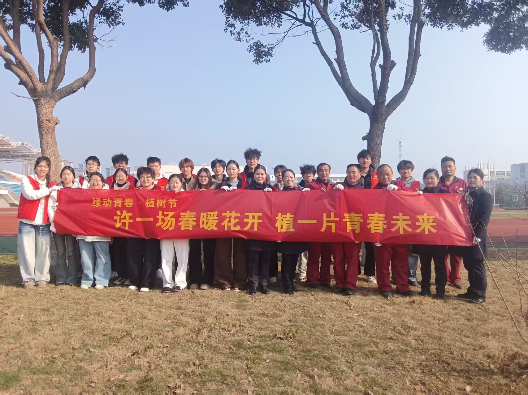 植树现场,全体参与者分工协作、默契配合。大家挥锹铲土、扶正树苗、培土压实、提水浇灌,各个环节井然有序、有条不紊。一株株新苗在春风中傲然挺立,承载着现场全体师生对校园的美好期许,彰显着大家尊重自然、爱护生态的责任与担当。