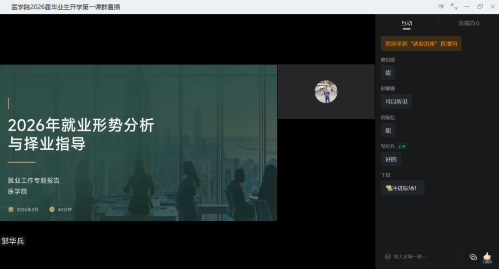 为扎实做好2026届毕业生就业工作,帮助毕业生认清就业形势、明确择业方向,3月11日晚,医学院党总支副书记(主持工作)邹华兵以“2026年就业形势分析与择业指导”为主题,为全体2026届毕业生讲授就业指导“开学第一课”,为毕业生求职择业精准导航。