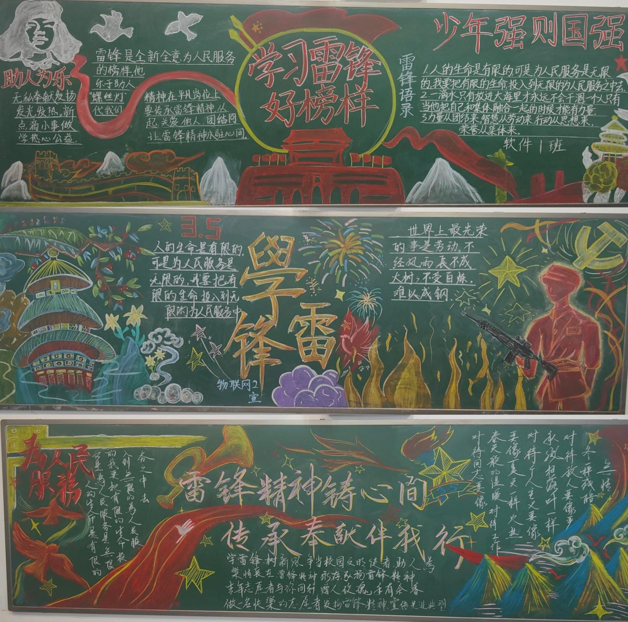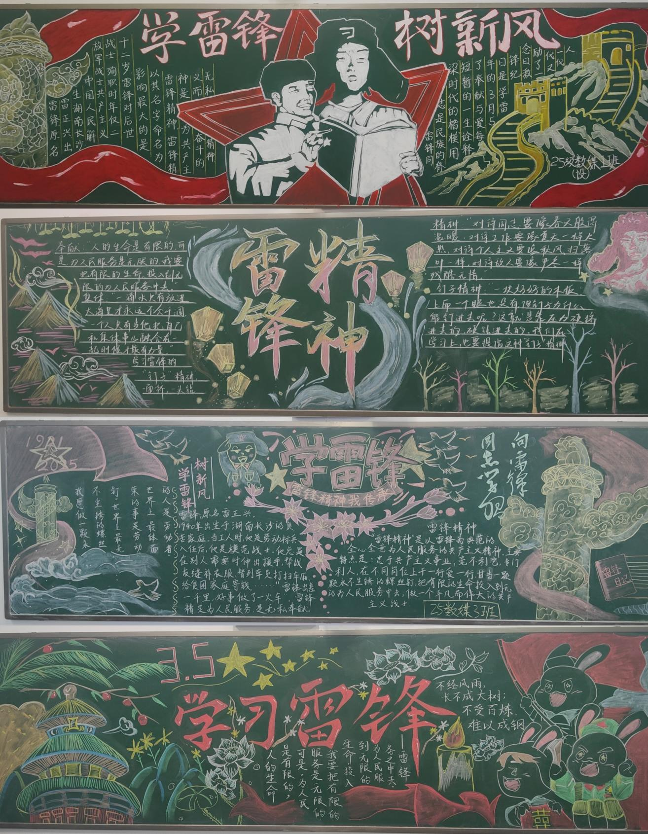 活动中,各班级积极响应、精心筹备。同学们结合专业特色,围绕雷锋事迹、雷锋名言、新时代志愿服务等内容,巧妙设计版面、认真书写绘画。一块块黑板报主题鲜明、图文并茂、创意十足,既展现了班级良好的精神风貌,也让雷锋精神在一笔一画中入脑入心,成为校园里一道传递正能量的靓丽风景。
