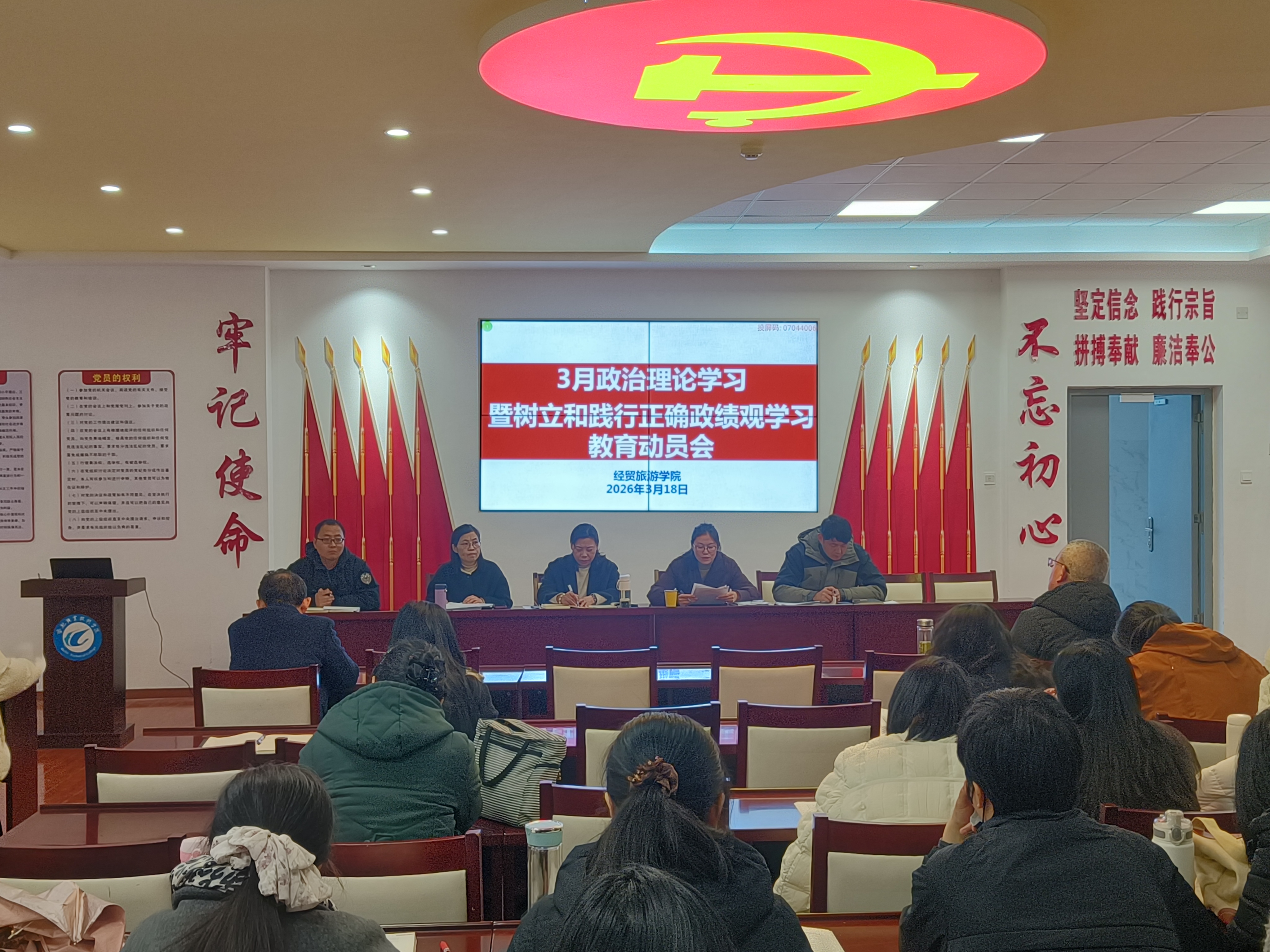 3月18日,经贸旅游学院在党性体验馆组织召开3月政治理论学习会暨树立和践行正确政绩观学习教育动员会,会议由该院副院长付晓兰主持,全体教职工参会。
