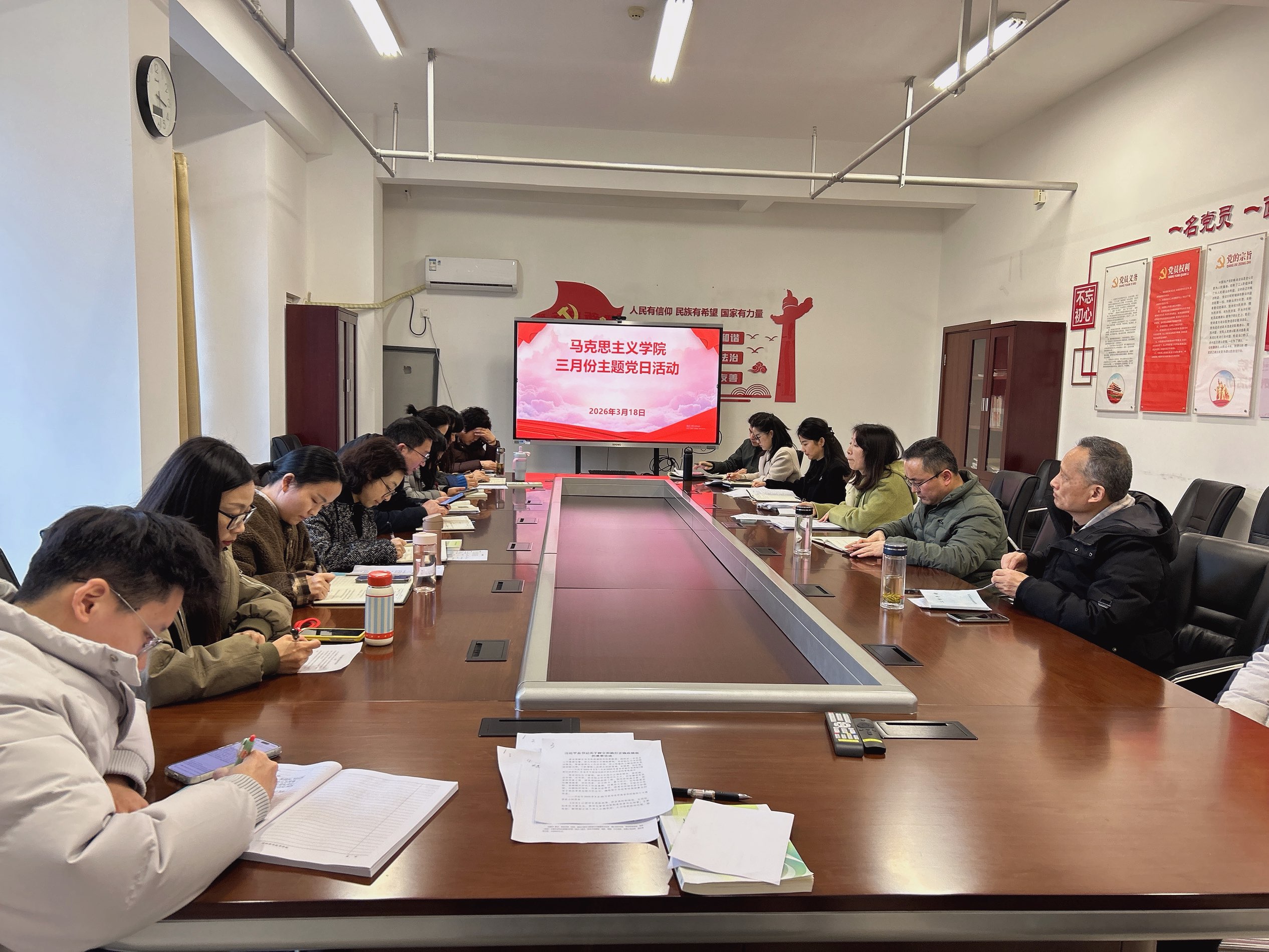 为持续深化理论学习,筑牢思想根基,3月18日下午,马克思主义学院在该院会议室组织开展三月份主题党日活动。该院党支部书记王文飞、院长胡心红和全体教职工参会。会议由概论教研室主任杨帆主持。